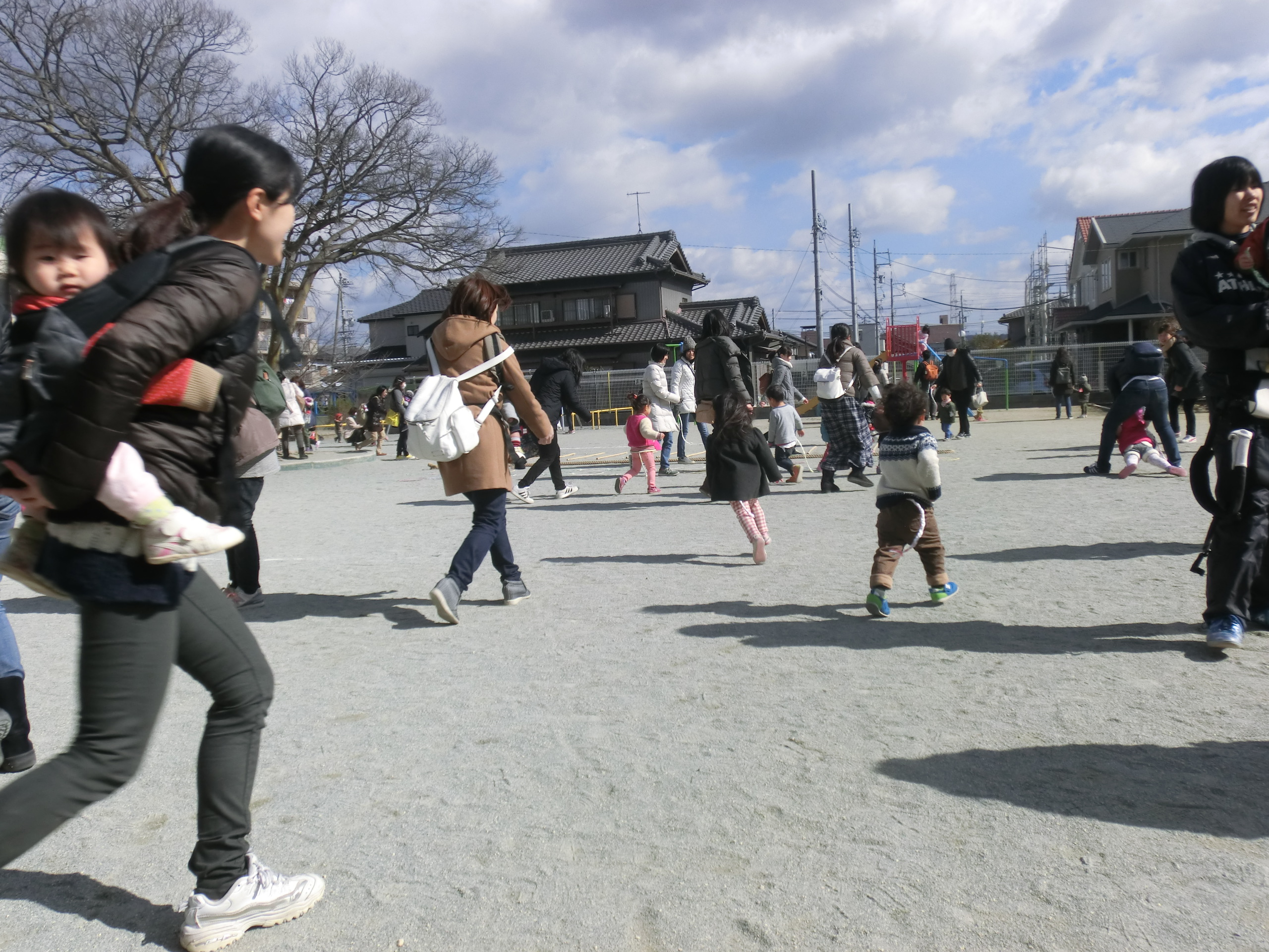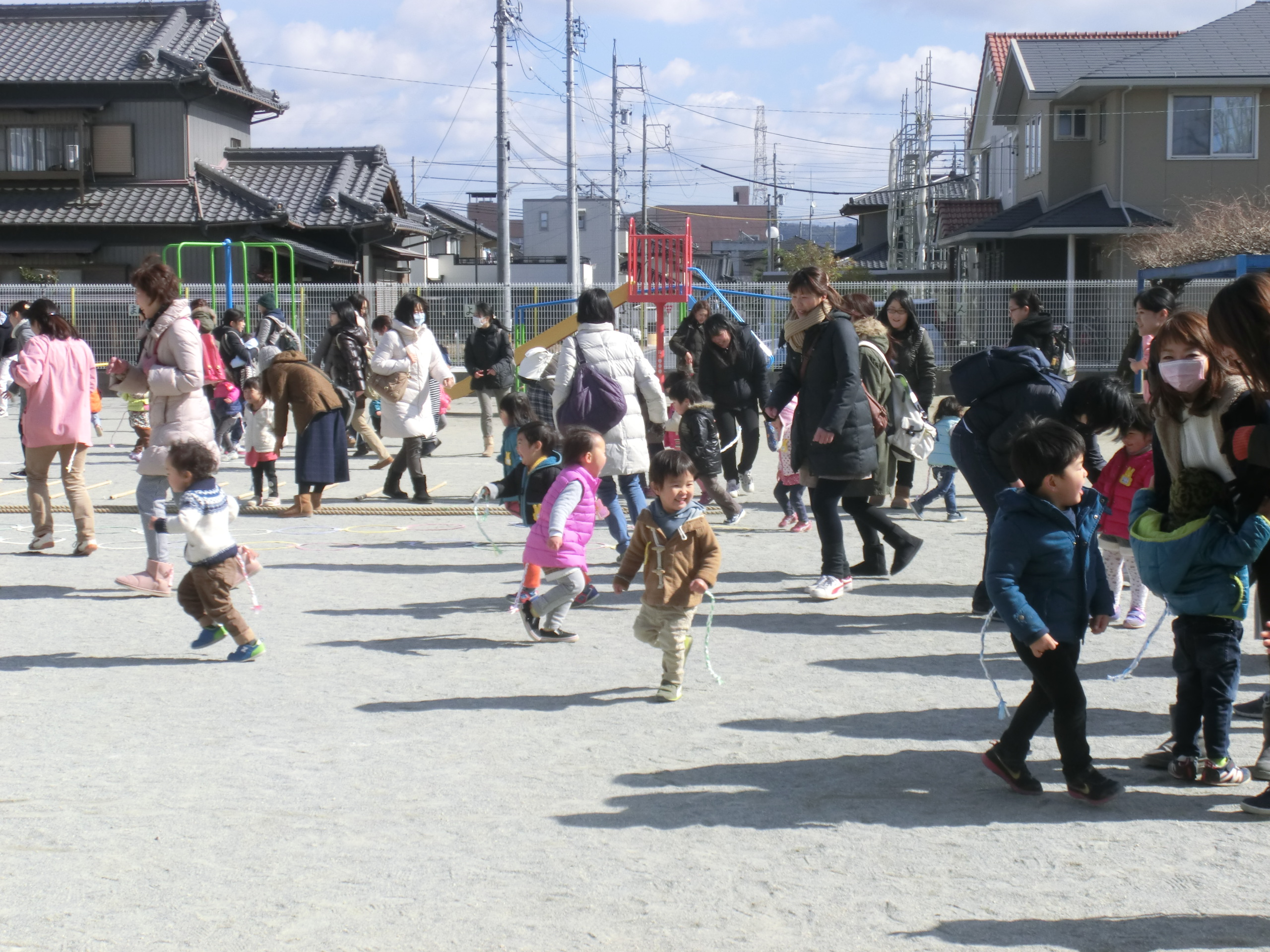 今日は、自由遊びの時に、年中さんの縄跳びや年長さんのラジオ体操やリレーを観ました。一緒に応援したり、自分も走り出しそうなお友達もいました。 遊戯室の「サーキット遊び」も毎回少しづつ変わっていて、みんな楽しそうです。 そして、最後に「しっぽとり遊び」をしました。 カラフルなしっぽをつけた お母さんを追いかけてしっぽを取ったり、自分につけて逃げ回ったり、先生のしっぽを一生懸命追いかけたりして、楽しくて、体もぽかぽかになりました。