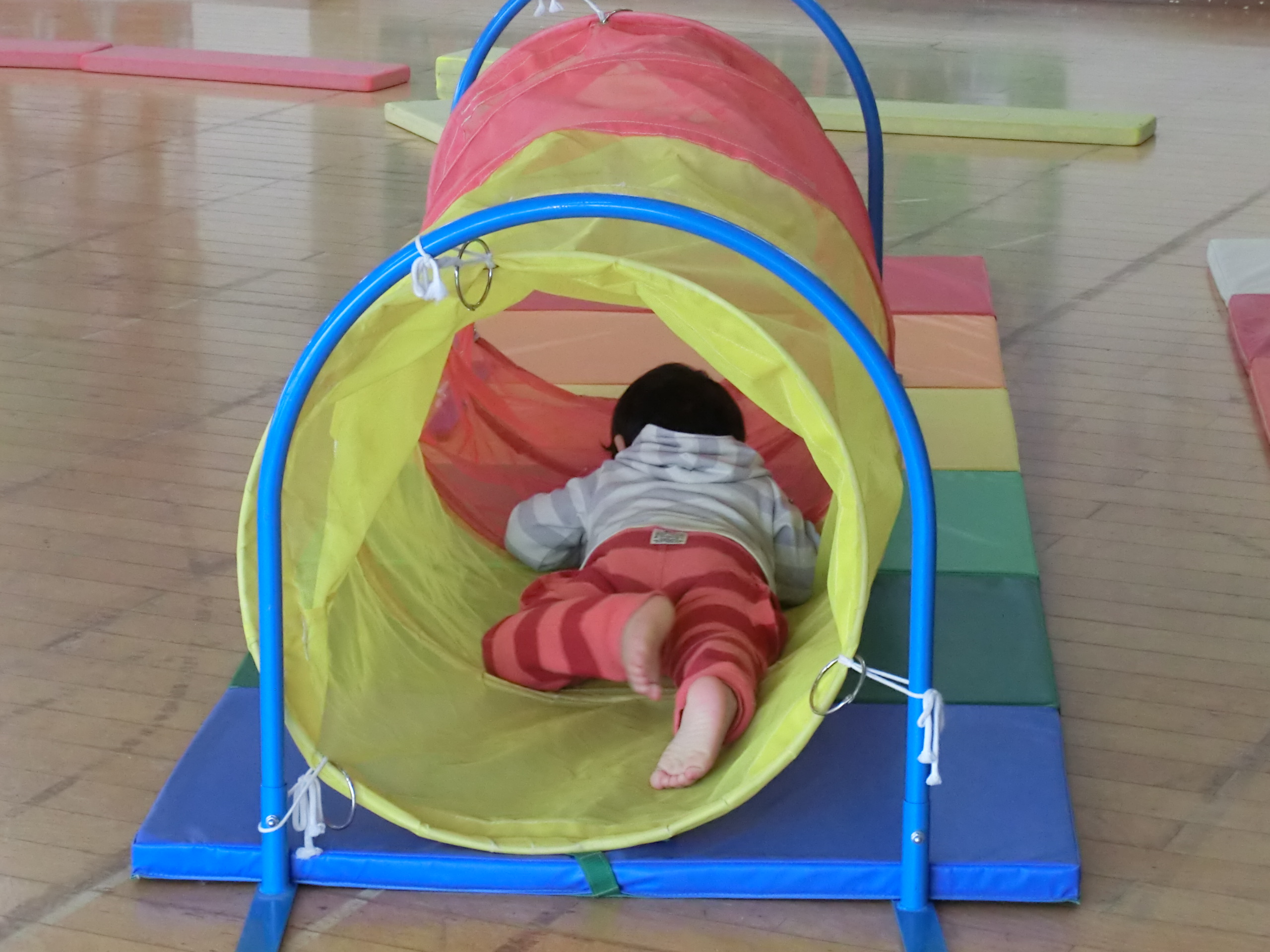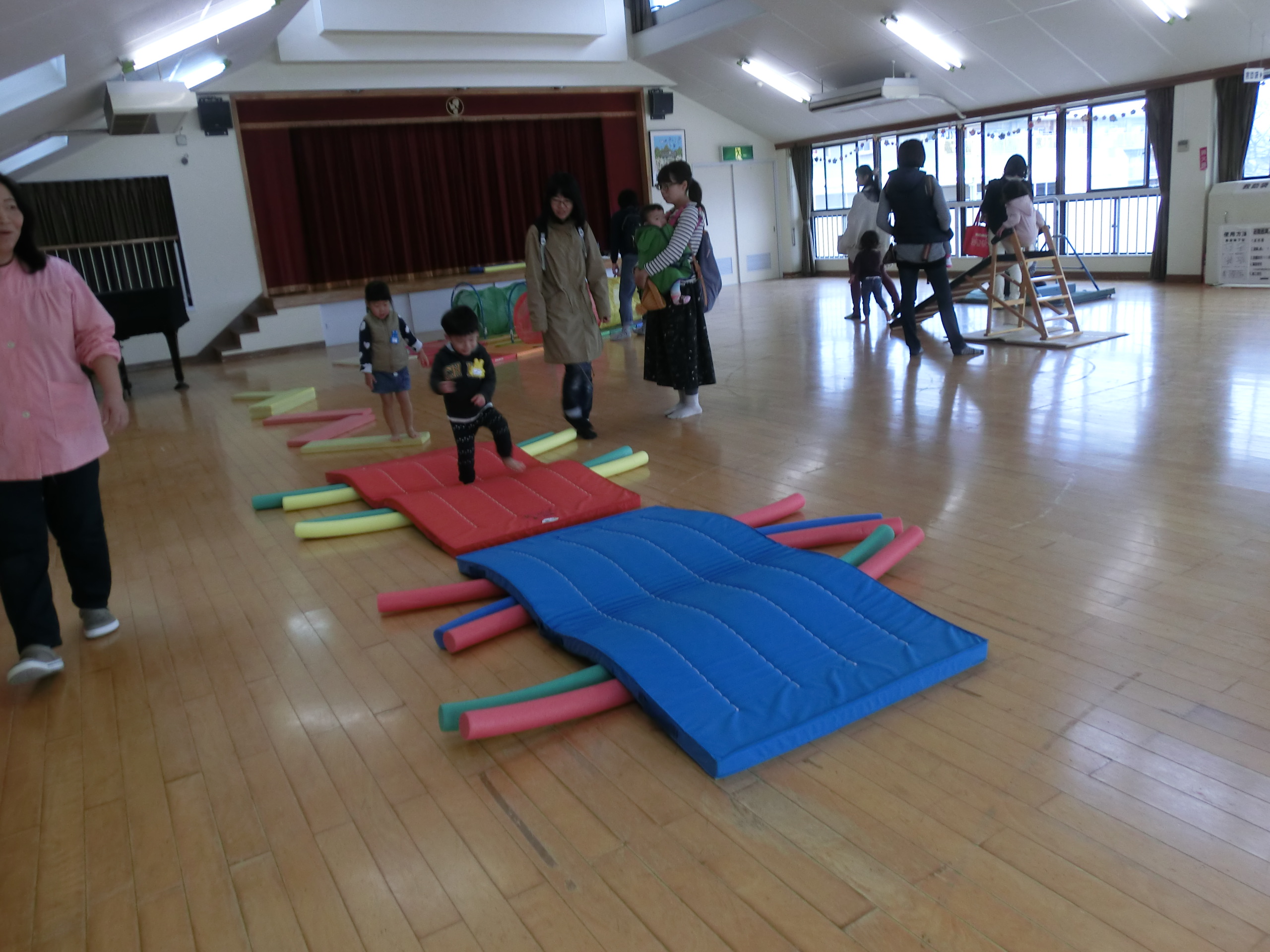 今日も、砂場は大人気で、大きなスコップや小さなスコップを使って、お父さんやお母さんと一緒に楽しそうです。 また、連日行っている、遊戯室の「サーキット遊び」も大変好評です。
