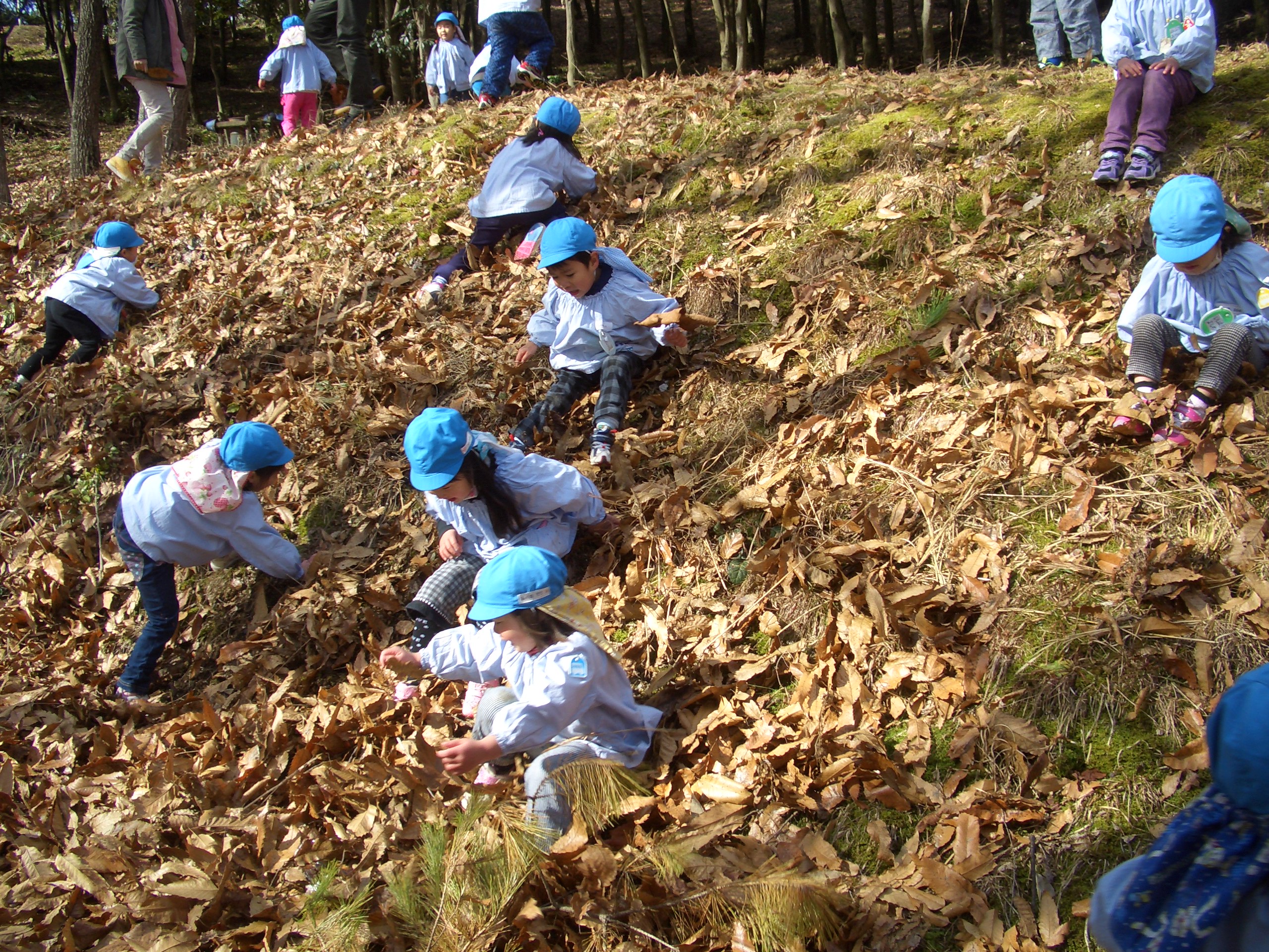 写真は、3歳児の積木遊びと、園外保育の様子です。
