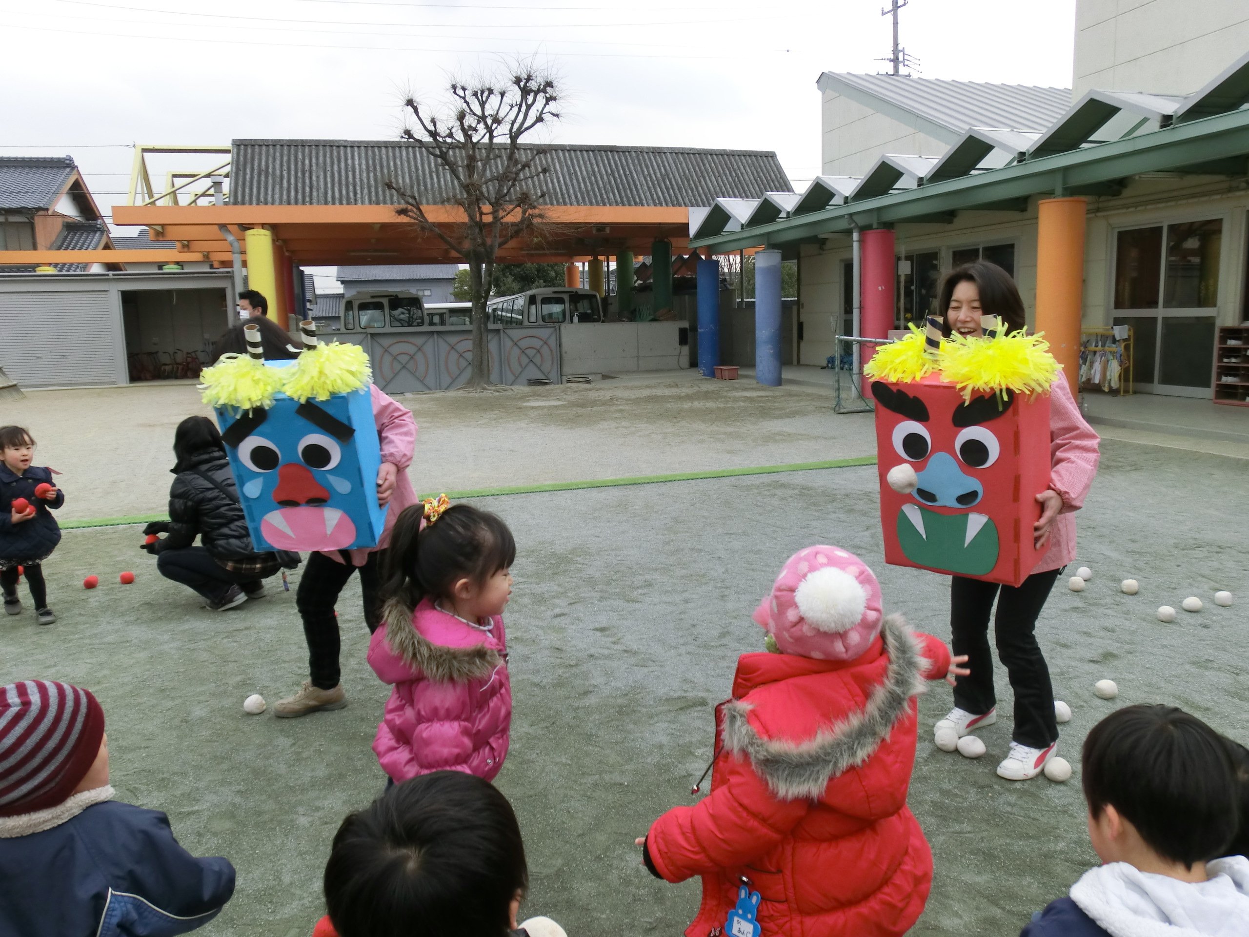 みんなの元気パワーで、鬼さん達も「にこにこ」鬼になって、帰って行きました。