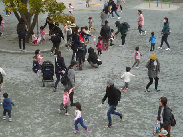 砂場遊びは、いつも大人気で、ケーキを作ったり、山を作ったりして、それぞれの遊びを楽しんで いました。 3回目の今日のしっぽとりは、慣れてきたお友だちも多く、ニコニコして追いかけたり、追いかけられたりする姿がありました。 先生のしっぽを狙って走ってくるお友達も増えてきました。 ちょっぴり、寒かった体もぽかぽかになりました。