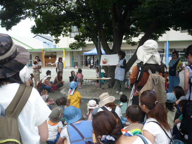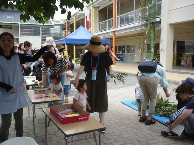暑い中、元気に来てくれたお友達は、お家の方と時々日陰でお茶を飲みながら 上手に遊んでいました。 今日は水のバケツを用意して水遊びをしました。 また、先生がホースで水をまき始めると、たくさんのお友だちが寄ってきました。 頭から水がかかっても、とても嬉しそうで、気持ちよさそうでした。