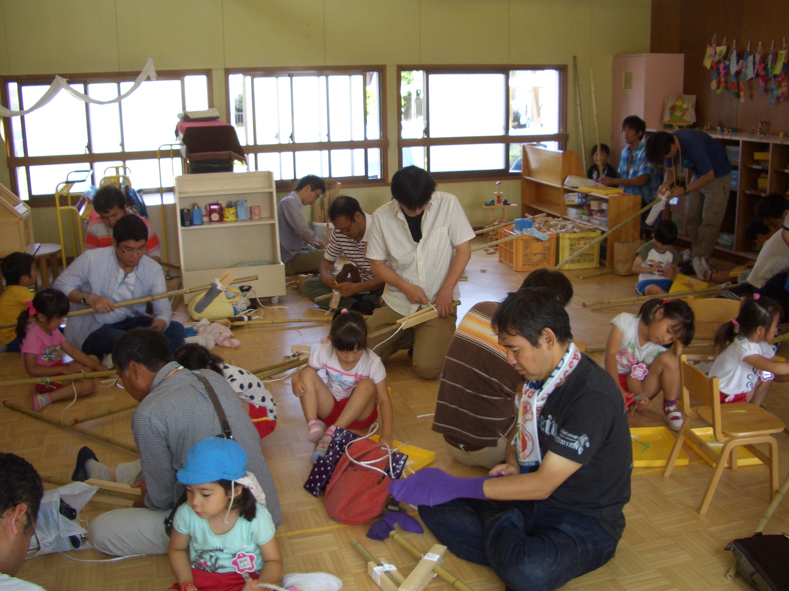 お父さんとたくさん触れ合いながら親子体操をしたり、年少はしっぽとり、年中は障害物リレー、年長は竹馬を作りました。