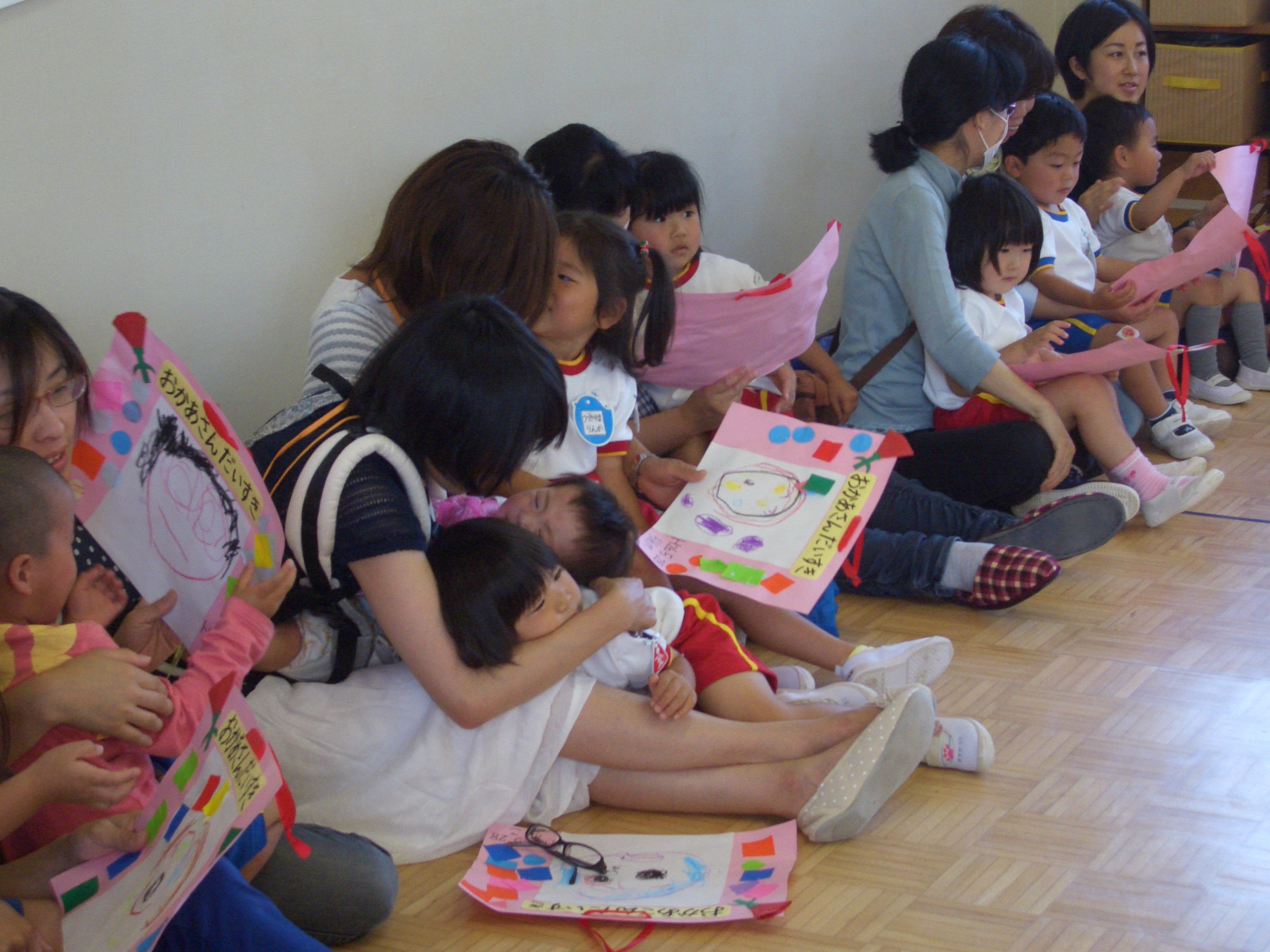 幼稚園にお母さんが来る!と朝から嬉しそうな表情をする年少児。照れながらも、初めての園生活をお母さんに見せることができました。年長、年中も各クラスで違う活動をし、その後に母の日のプレゼントを贈りました。