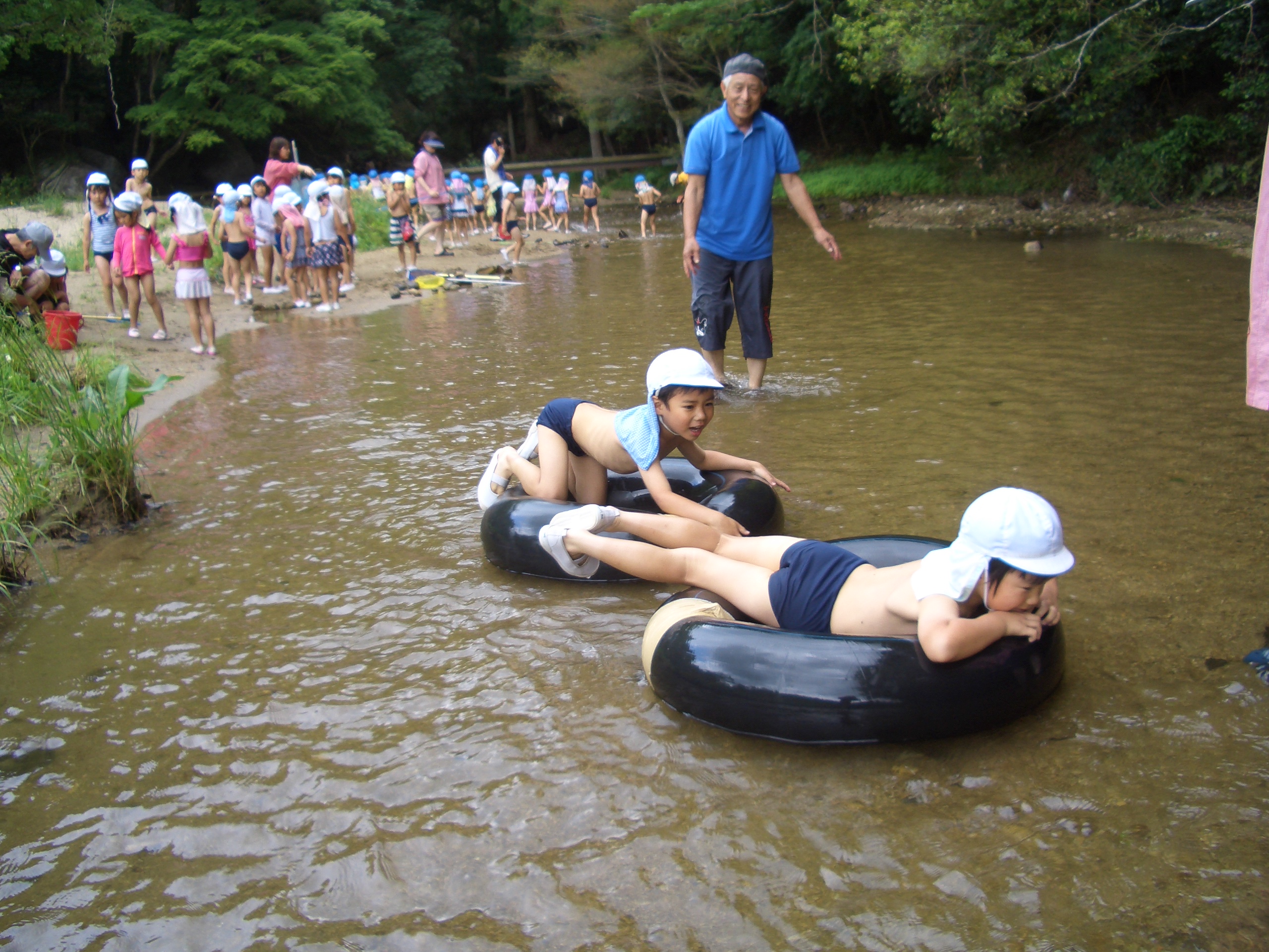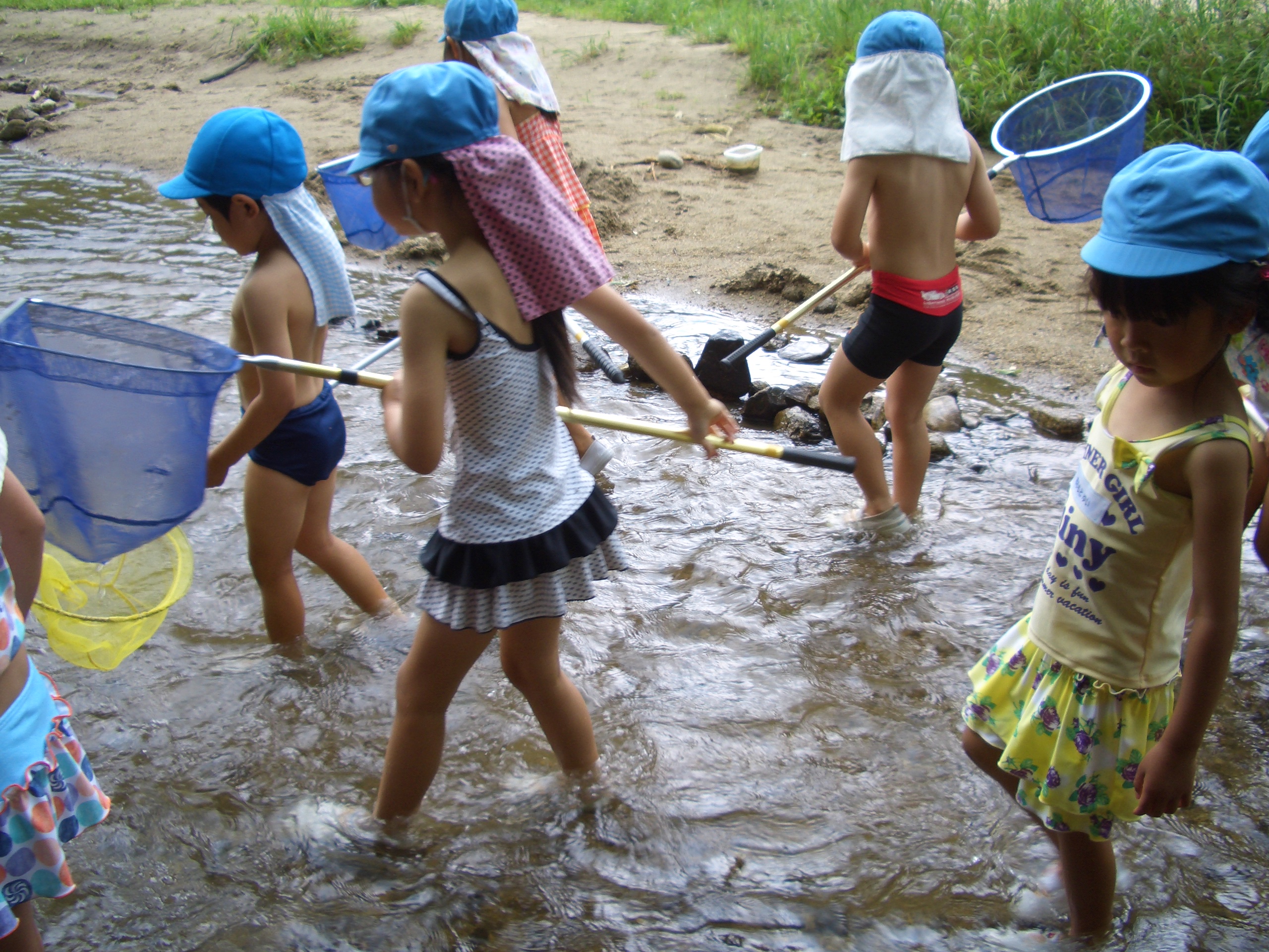 水鉄砲をしたり、カニ探しをしたり、魚を捕まえたりしました。自然に触れて遊ぶことで、子どもたちは心も体もとても解放されてきました。満足した笑顔がいっぱい見られました。