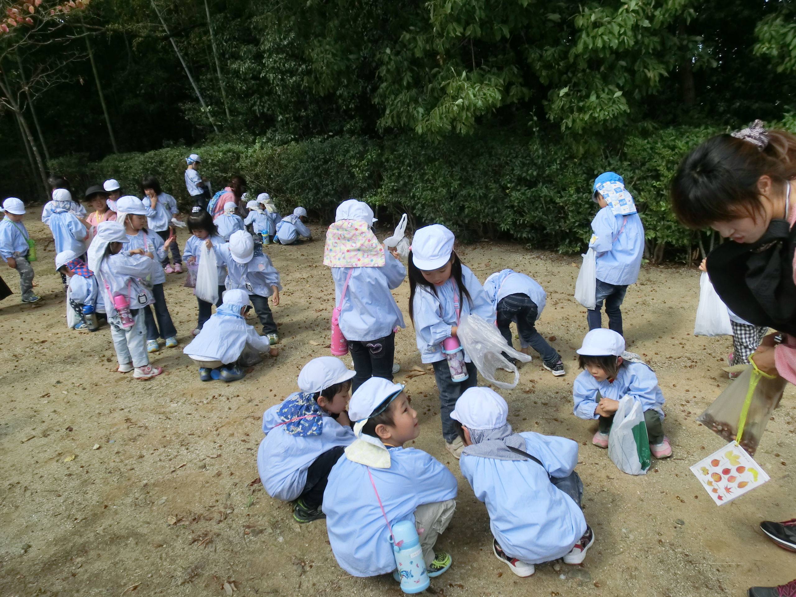 少し疲れた顔の子どもたちでしたが、たくさん落ちているどんぐりを見ると、目をキラキラ輝かせ、いろいろな形、大きさのどんぐりに夢中。。たっくさん拾って帰ってきました。