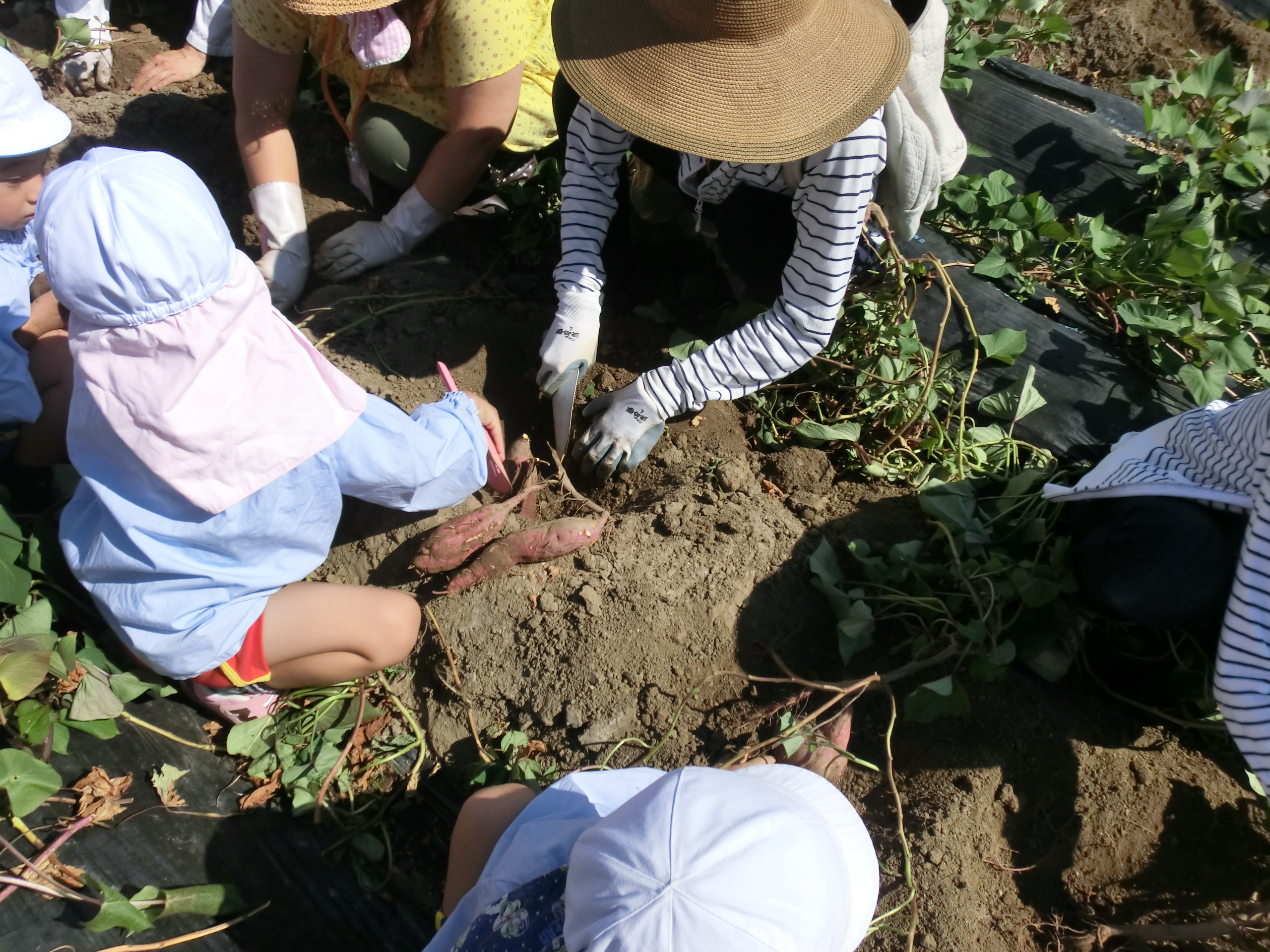 暑い中、芋を見つけ一生懸命掘る姿、「抜けないよ〜」と一瞬力が抜けて休憩する姿、抜けたお芋を大事に抱える姿など…微笑ましい姿がたくさん見られました。
