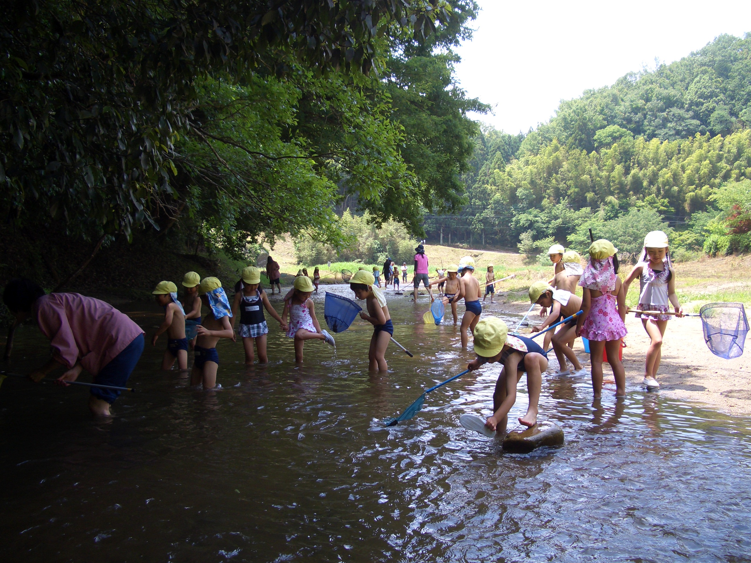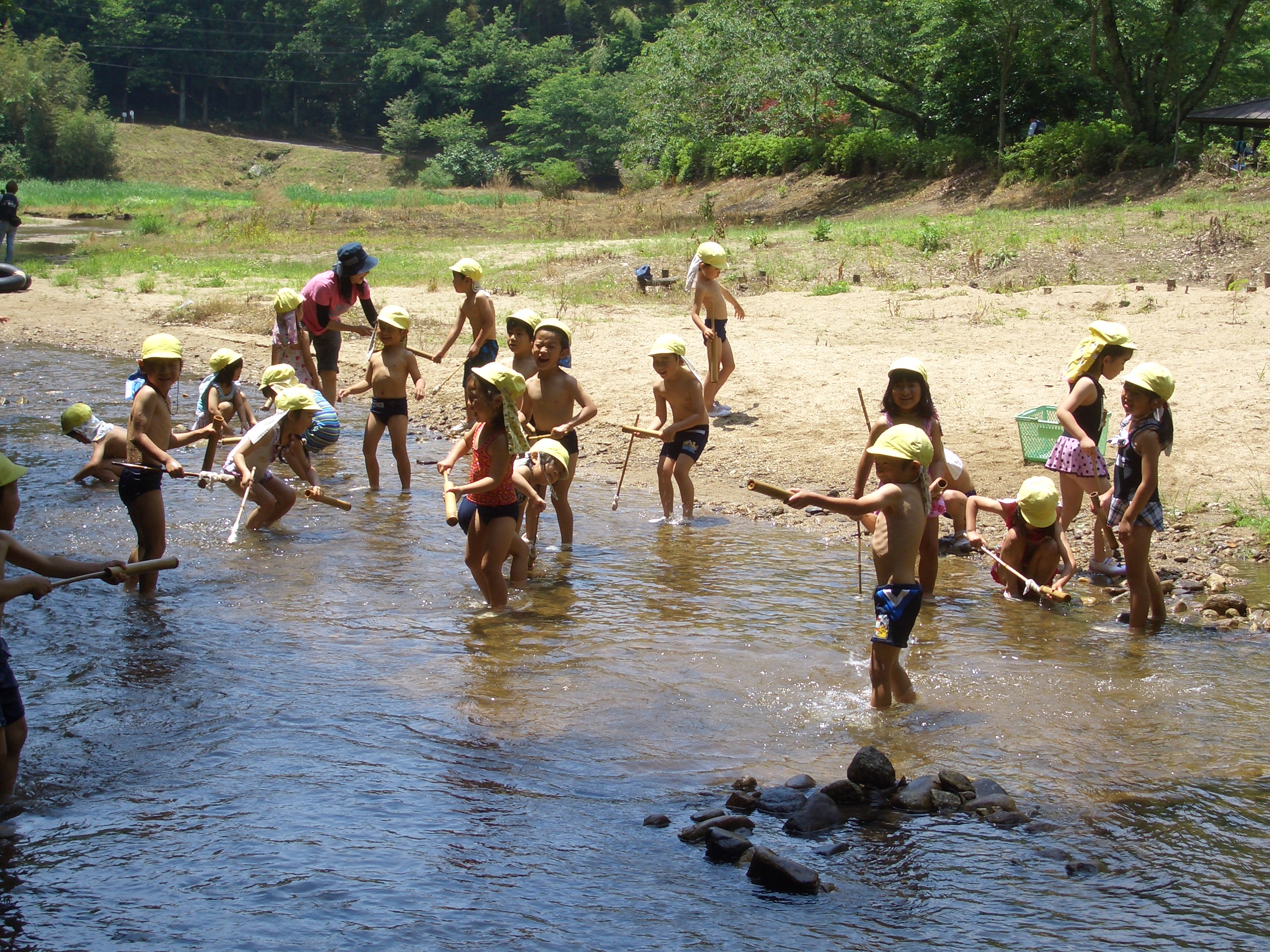 魚取りでは、魚を捕まえようと必死になる姿がありました。「魚とったよ」とタモに入った魚を見せてくれました。思い思いに過ごせた川遊びでした。