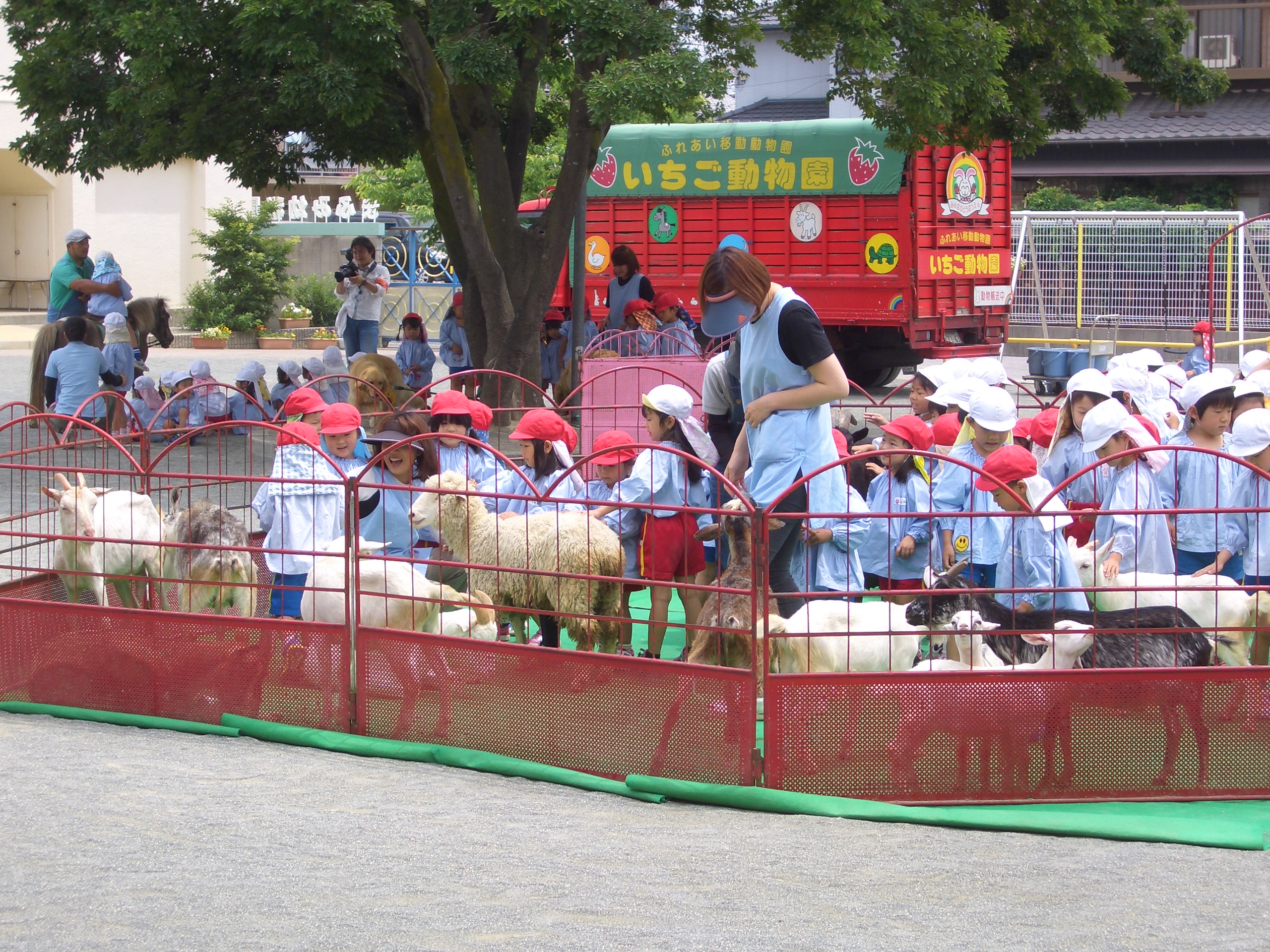 楽しみにしていた移動動物園。子どもたちは、怖がらずに手を伸ばして餌をあげている姿がありました。