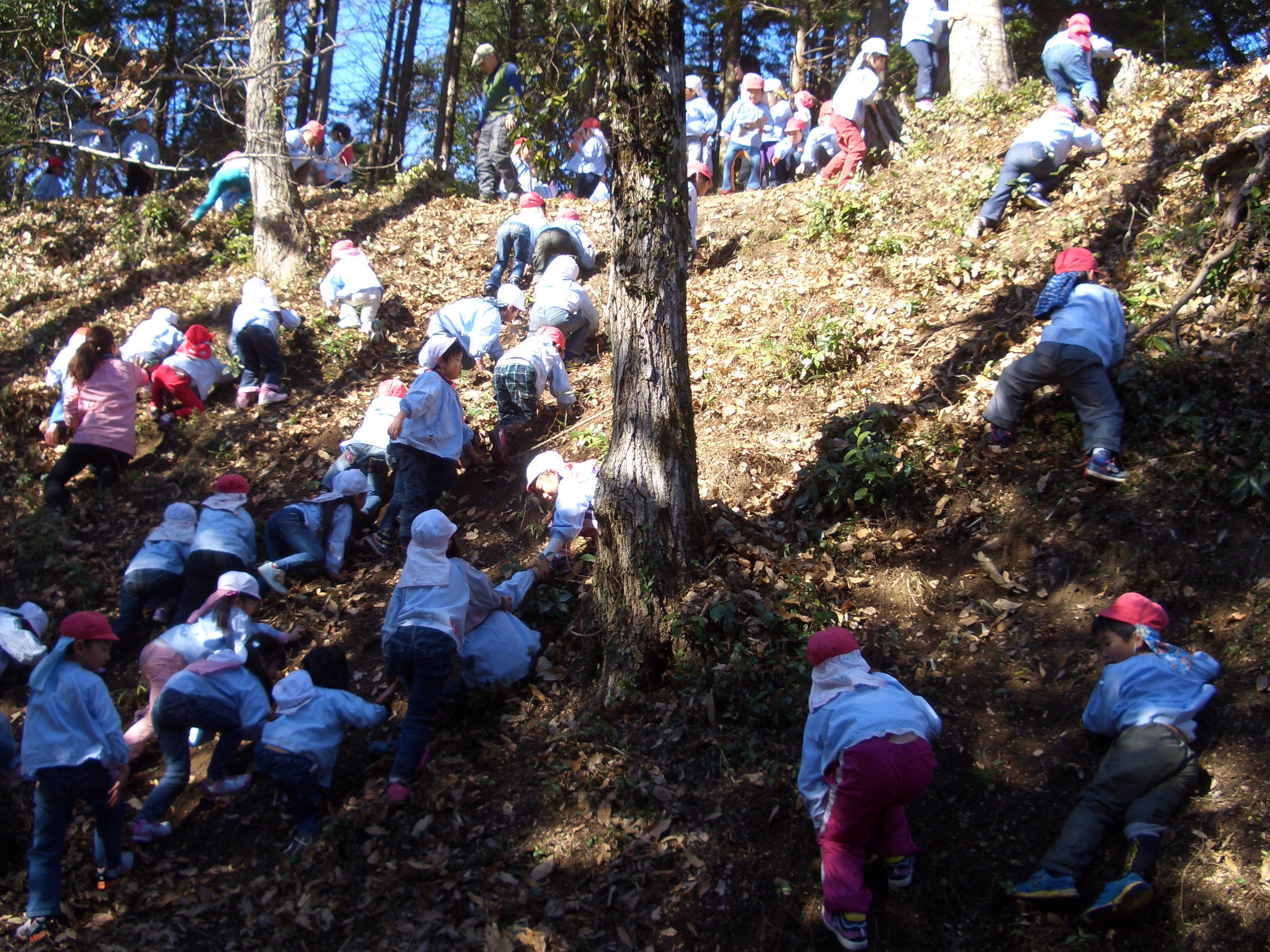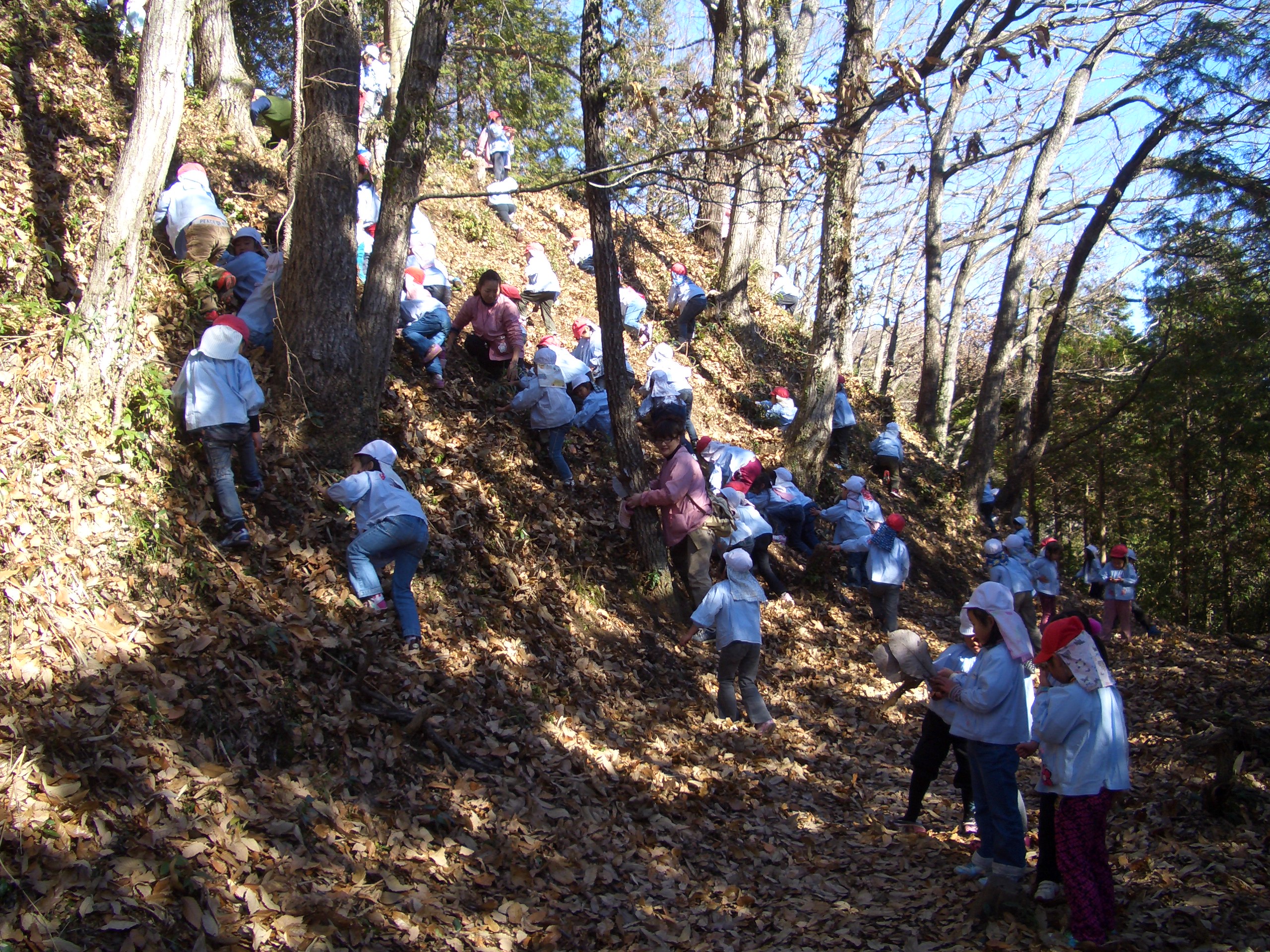 今日は、則定小学校の裏山登りに行ってきました。長い山道も、リュウノヒゲや赤い実を見つけて登りました。頂上に着いてから、葉っぱで遊んだり、急斜面をかけ登ったりと、とても頑張った子どもたちでした。