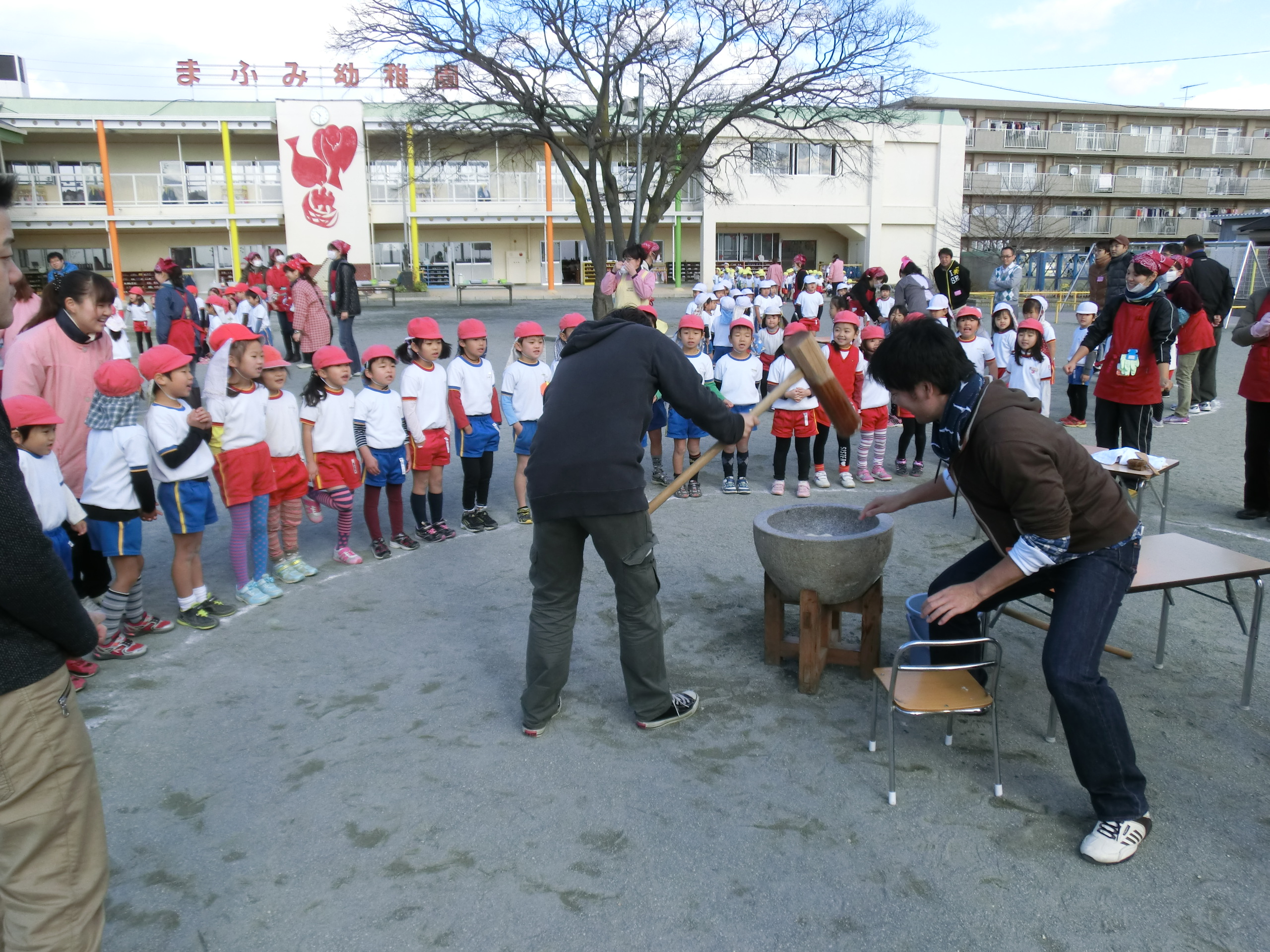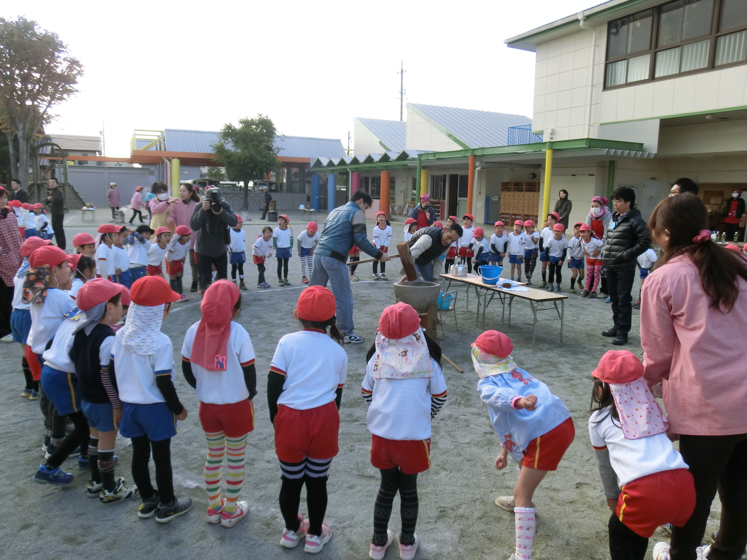 今日、もちつき会を行ないました。たくさんのお父さんの方にお手伝い頂き、「よいしょ!よいしょ!」と子どもたちの応援とともにおいしくつき上がりました。今年は、地元産のもち米を使ってしょう油・きなこの2種類のおもちをみんなでおいしく頂きました。