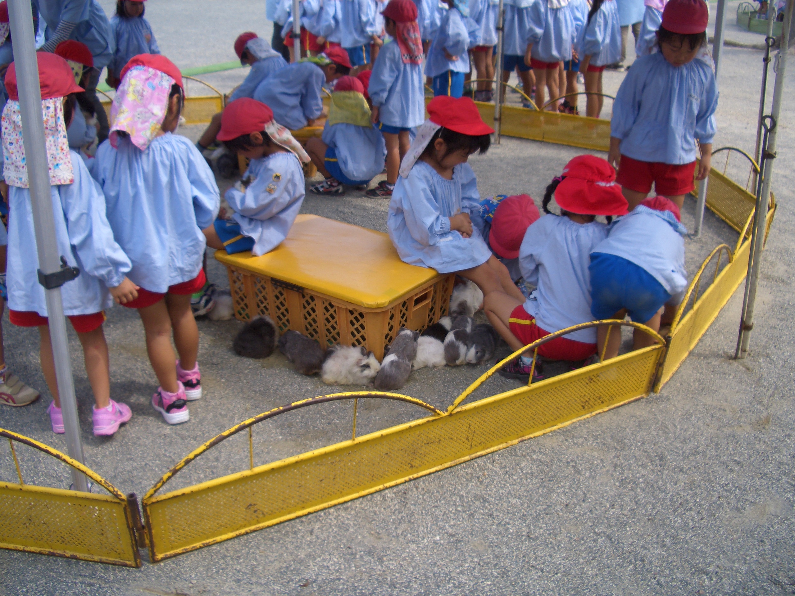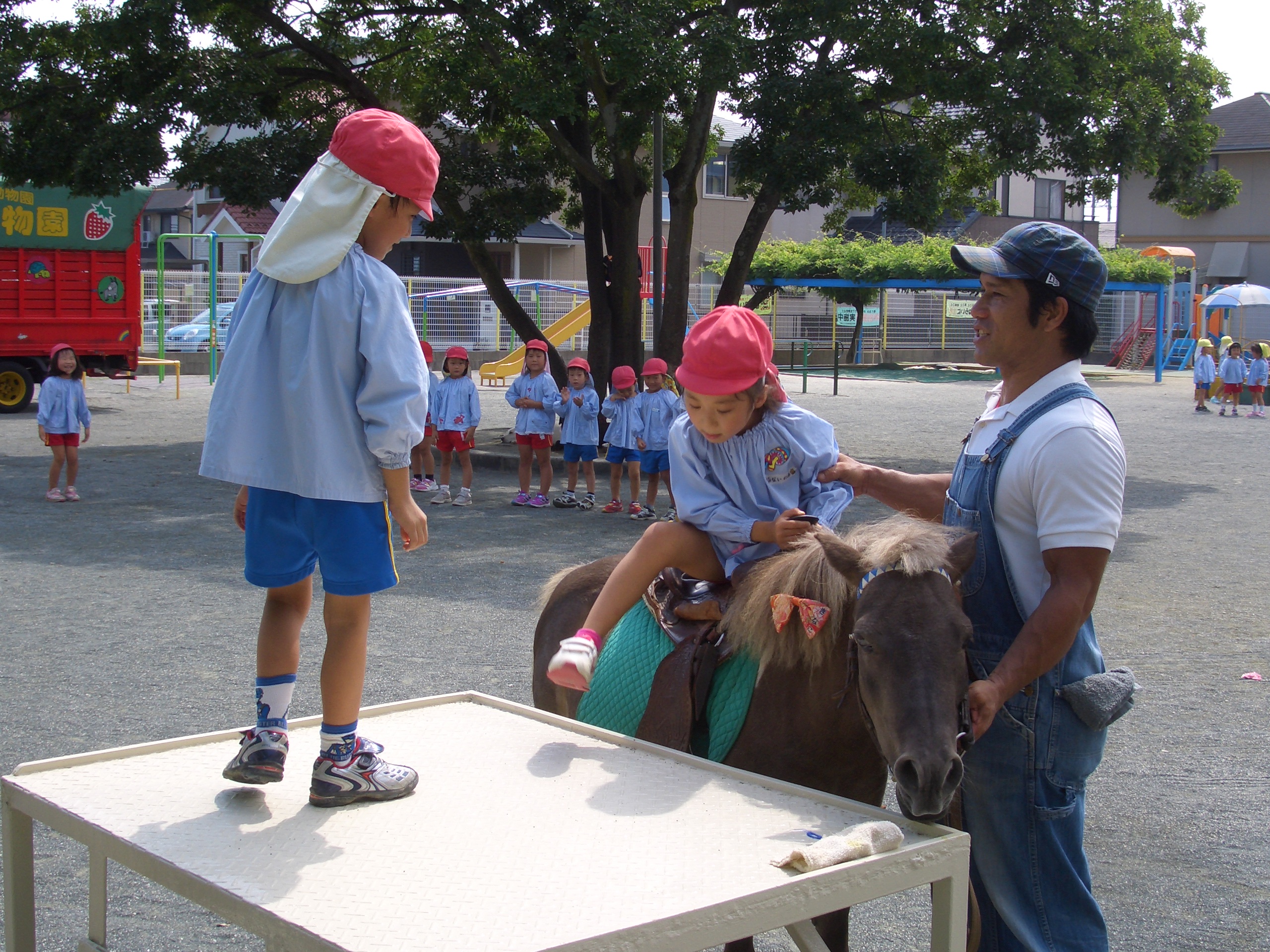 いちご動物園が幼稚園に遊びに来てくれました。動物にエサをあげたり、触れ合ったりとても楽しく過ごせました。年長さんは、「きなこちゃんがんばれ!」と大きな声で応援し、ポニーのきなこちゃんに乗せてもらいました。