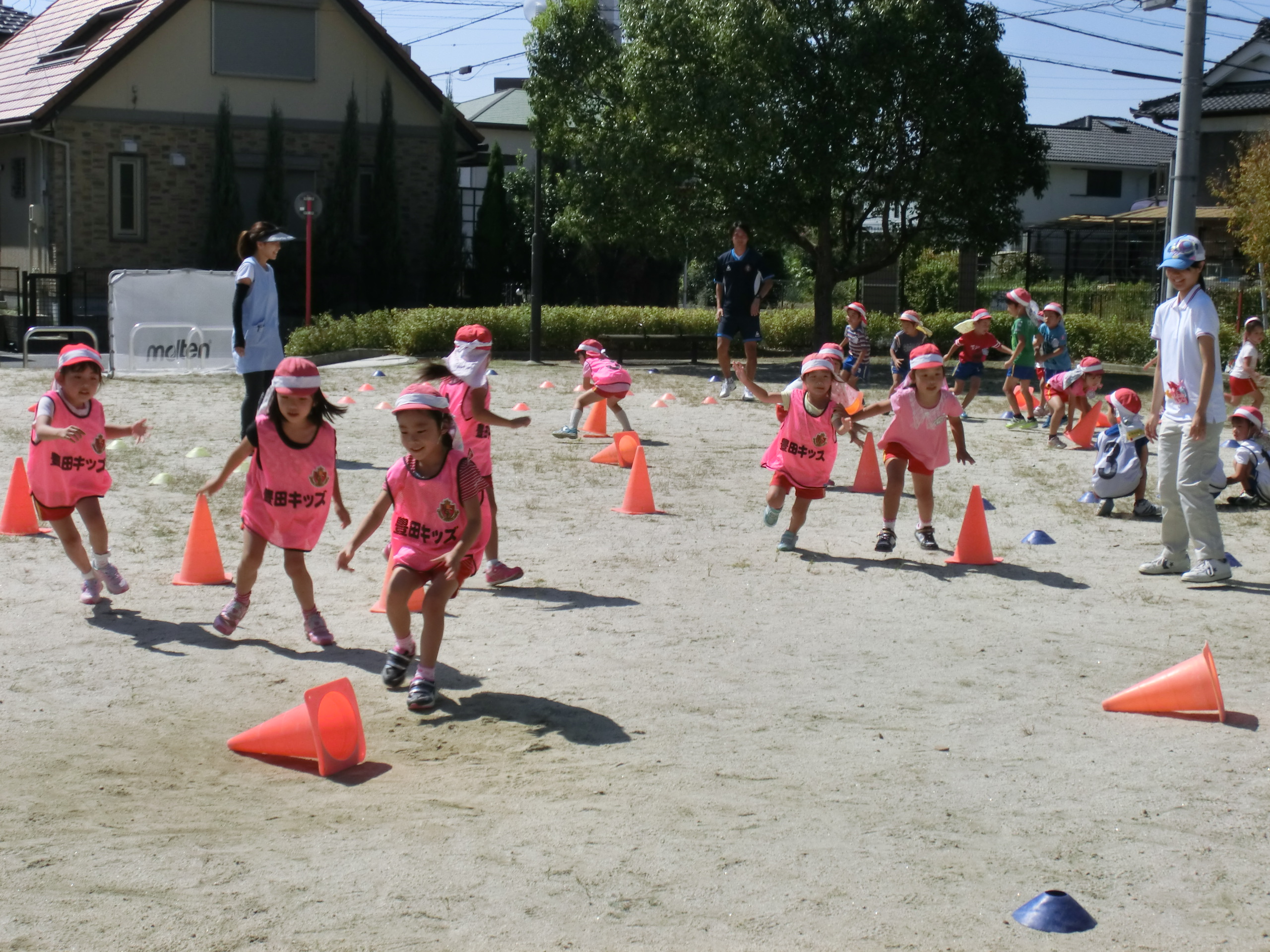 今日は、ドリブルの練習をしたり、コーンを使ったゲームで体を動かしました。その後は、子どもたちも楽しみにしていた試合をしました。転んでもすぐに起き上がり、ただひたすらにボールを追いかける姿は、とてもたくましく見えました。