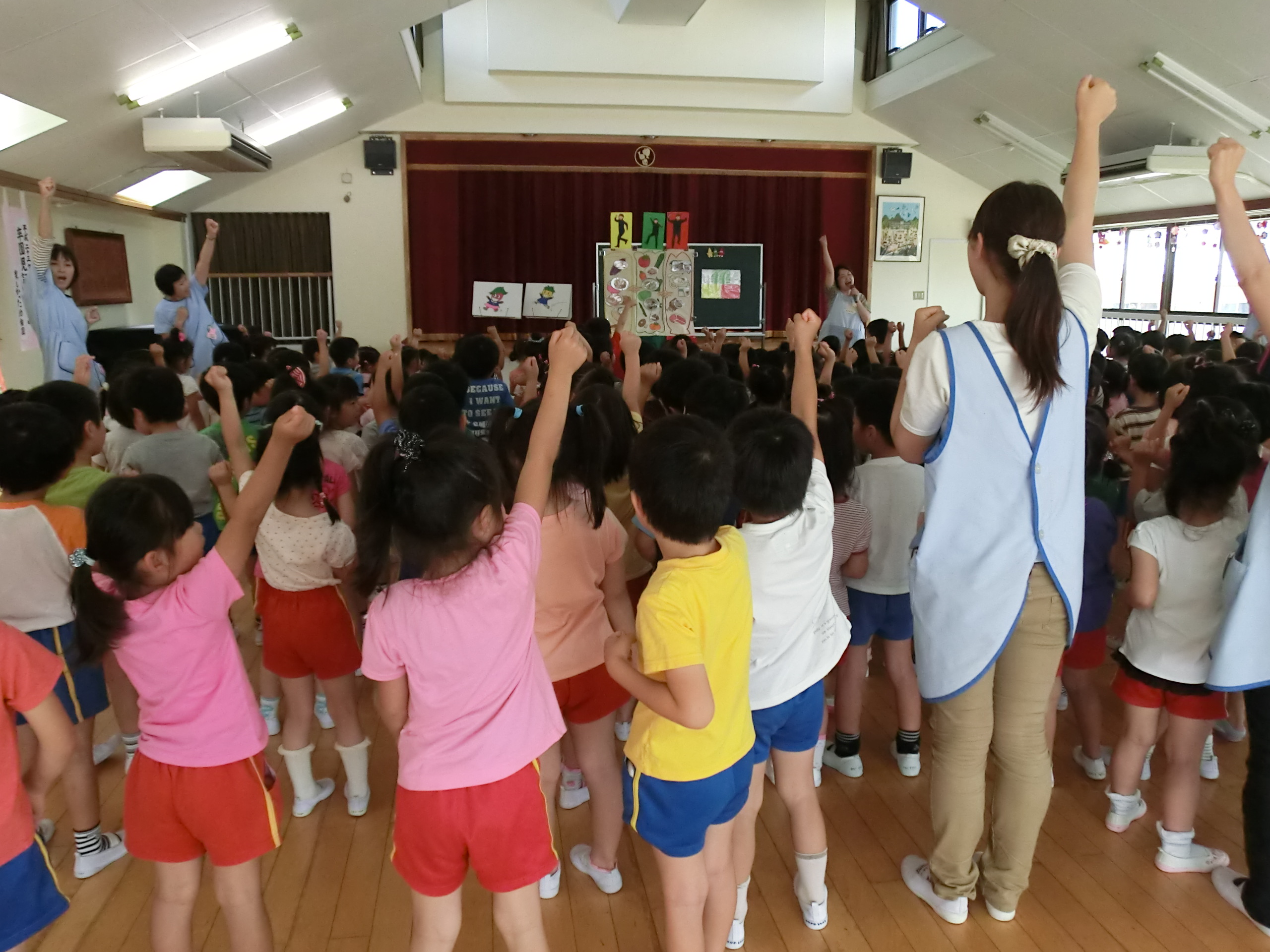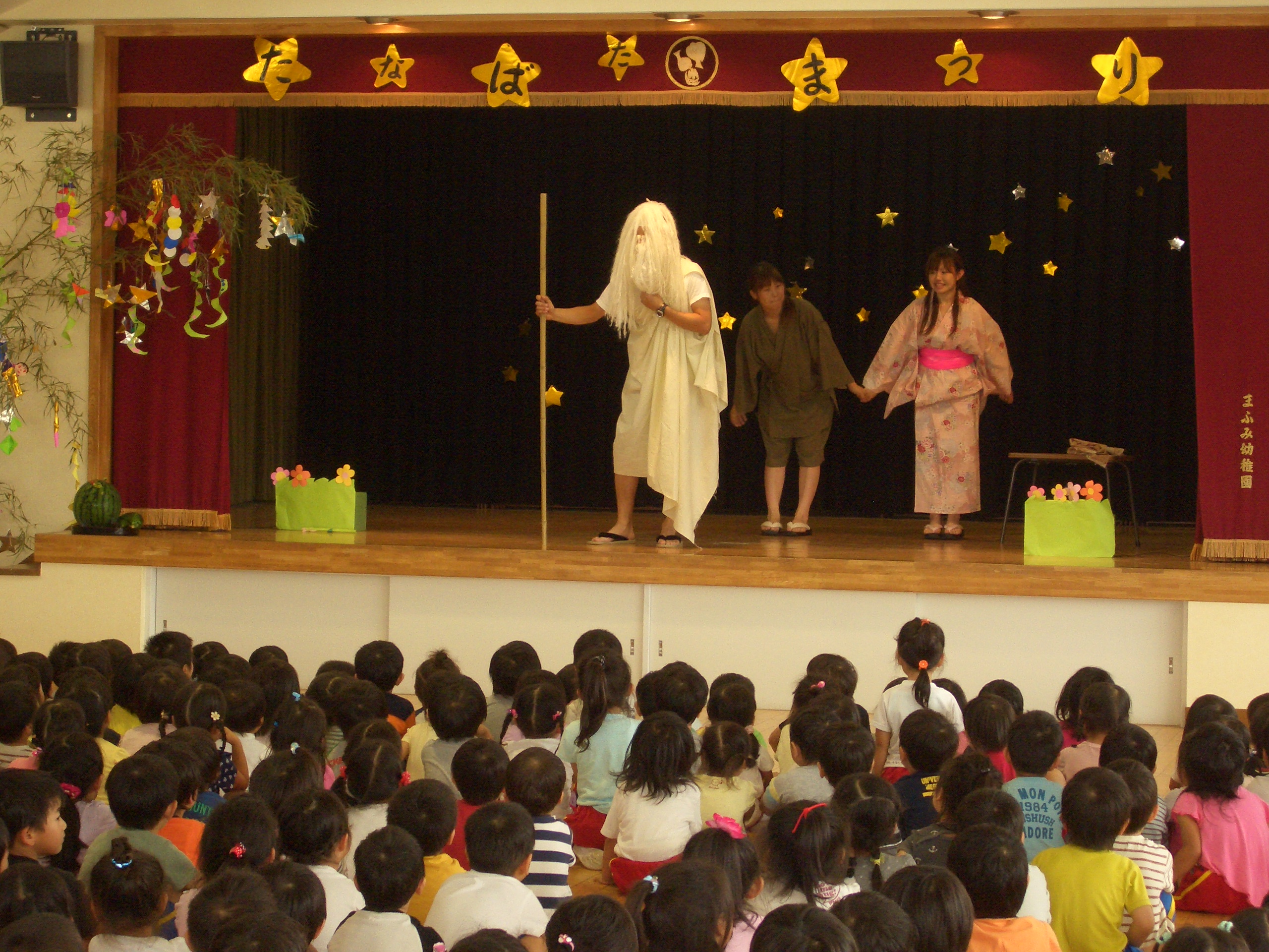 今日は七夕会。先生たちの劇ではすてきな、おり姫とひこ星そして仙人が出るたび笑いが起きていました。