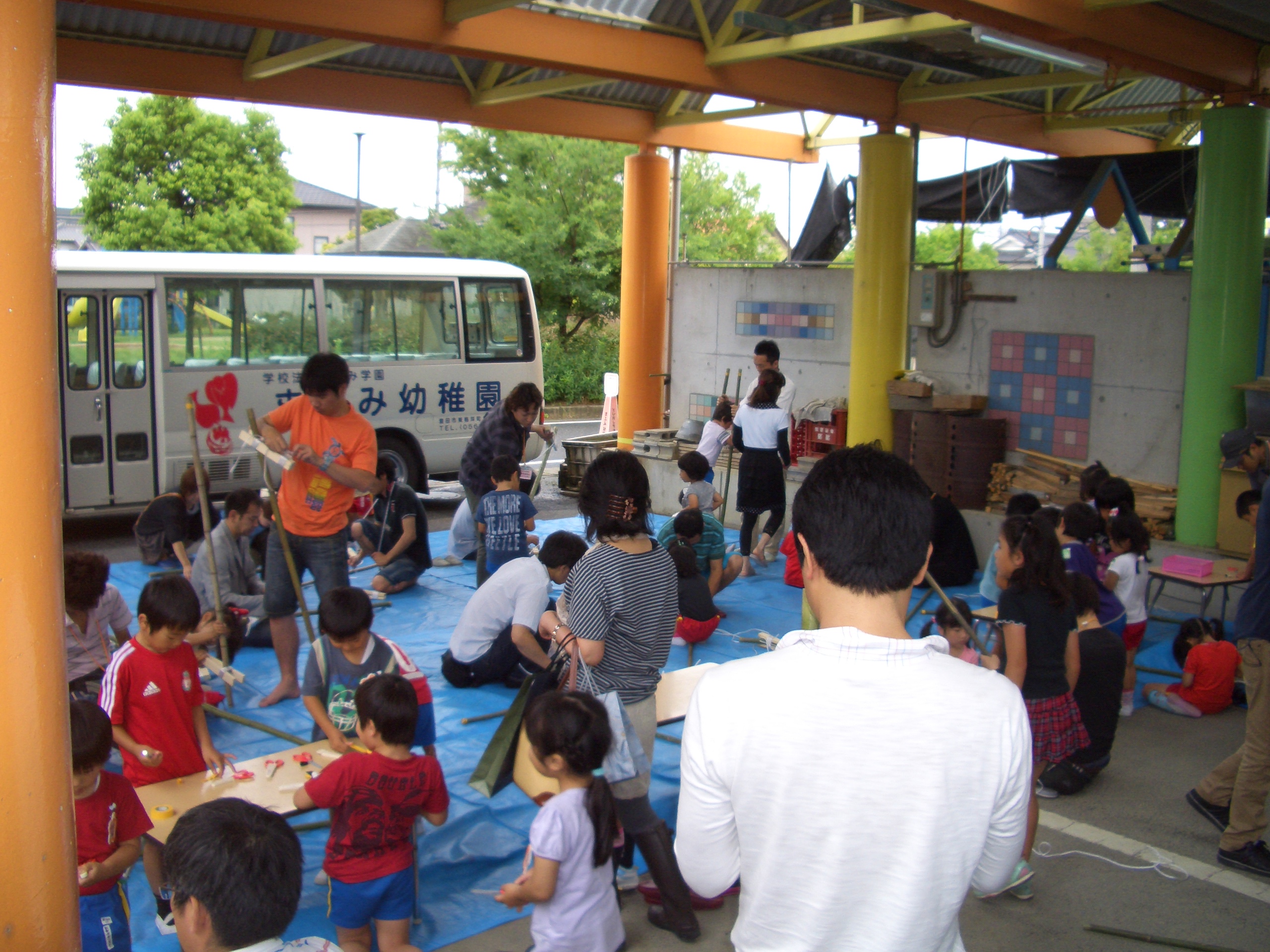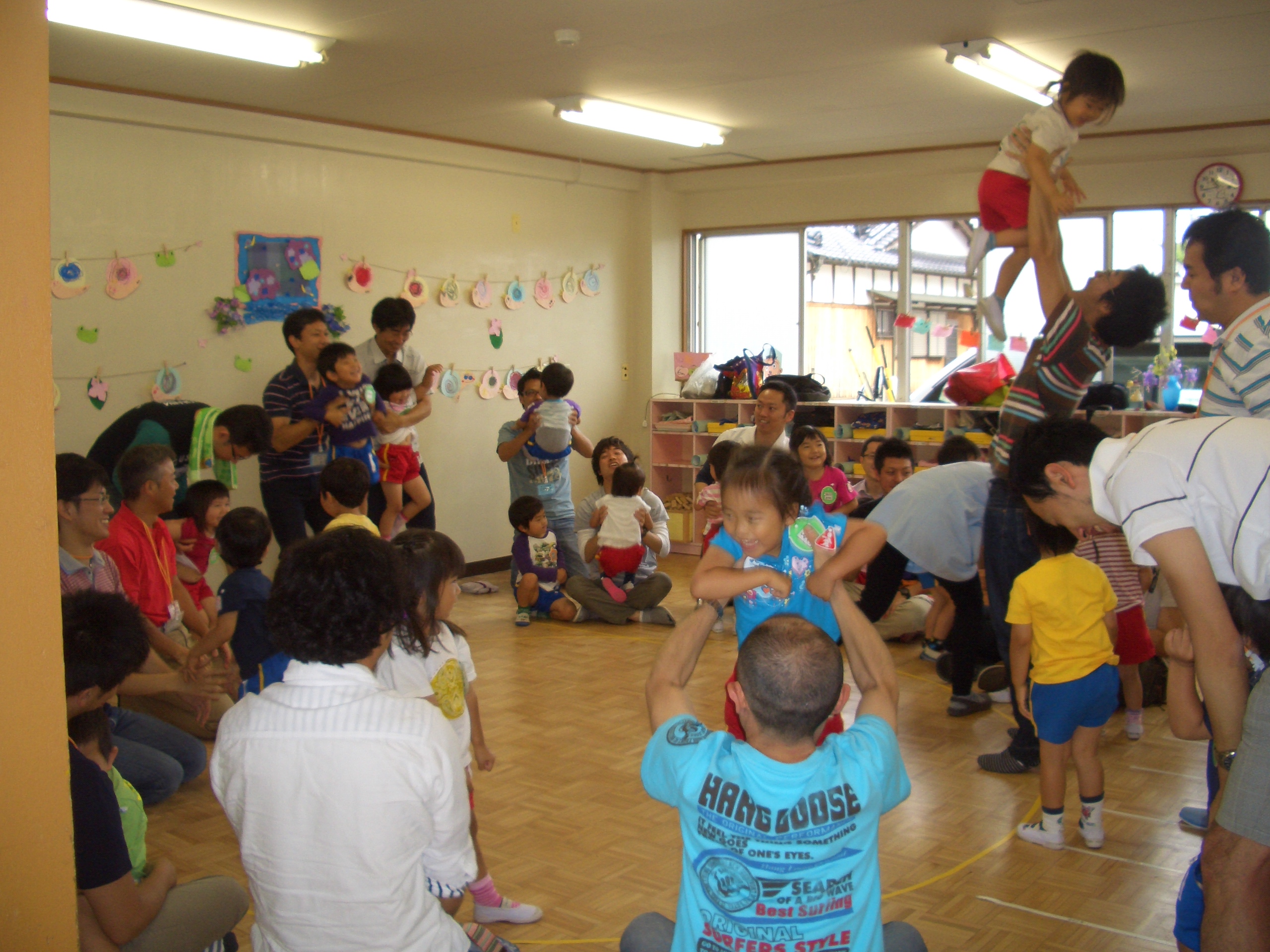 お家の方と一緒に、年長さんは自分の竹馬を作り、年中さんは親子リレー、年少さんはタオルでたくさん遊びました。残念ながら、雨が降ってしまいましたが、お友だちもお家の方も笑顔があふれていました。