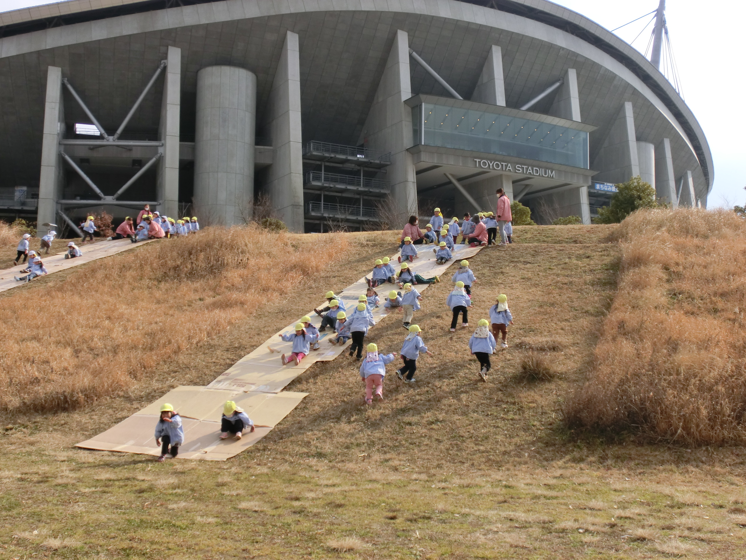 少し不安ながらも楽しみにしていた「芝すべり」 長い土手をお尻で滑ったり、スーパーマンのような姿でお腹で滑ったりと、何度も楽しんで滑りました。