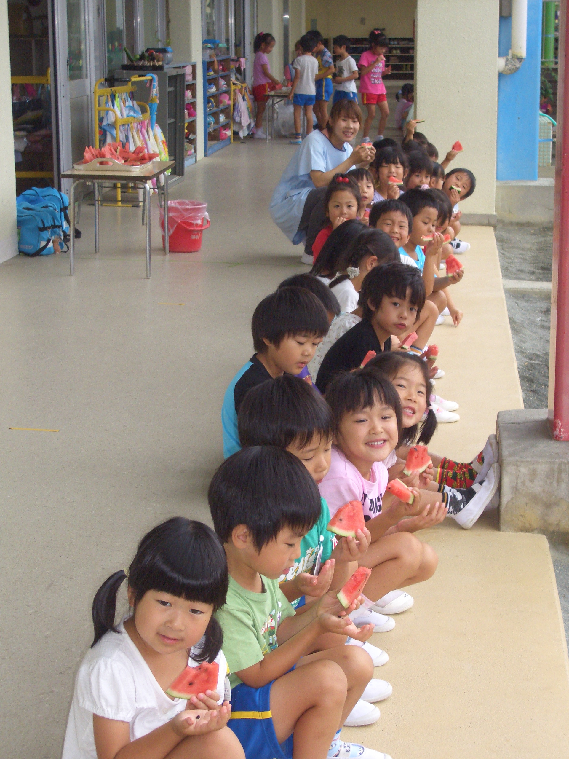 たくさんの七夕飾りや子どもたちの願いを込めた短冊を笹に飾り七夕会を楽しみました。七夕会の後はおいしいスイカをいただきました。