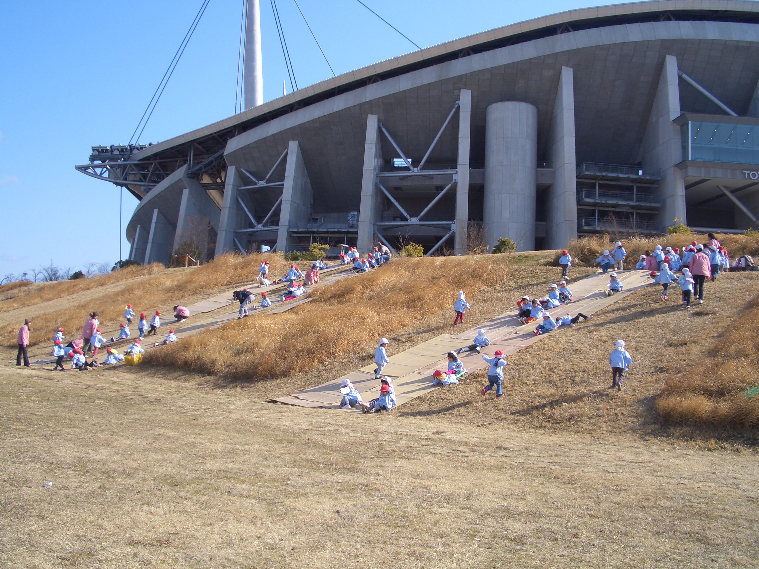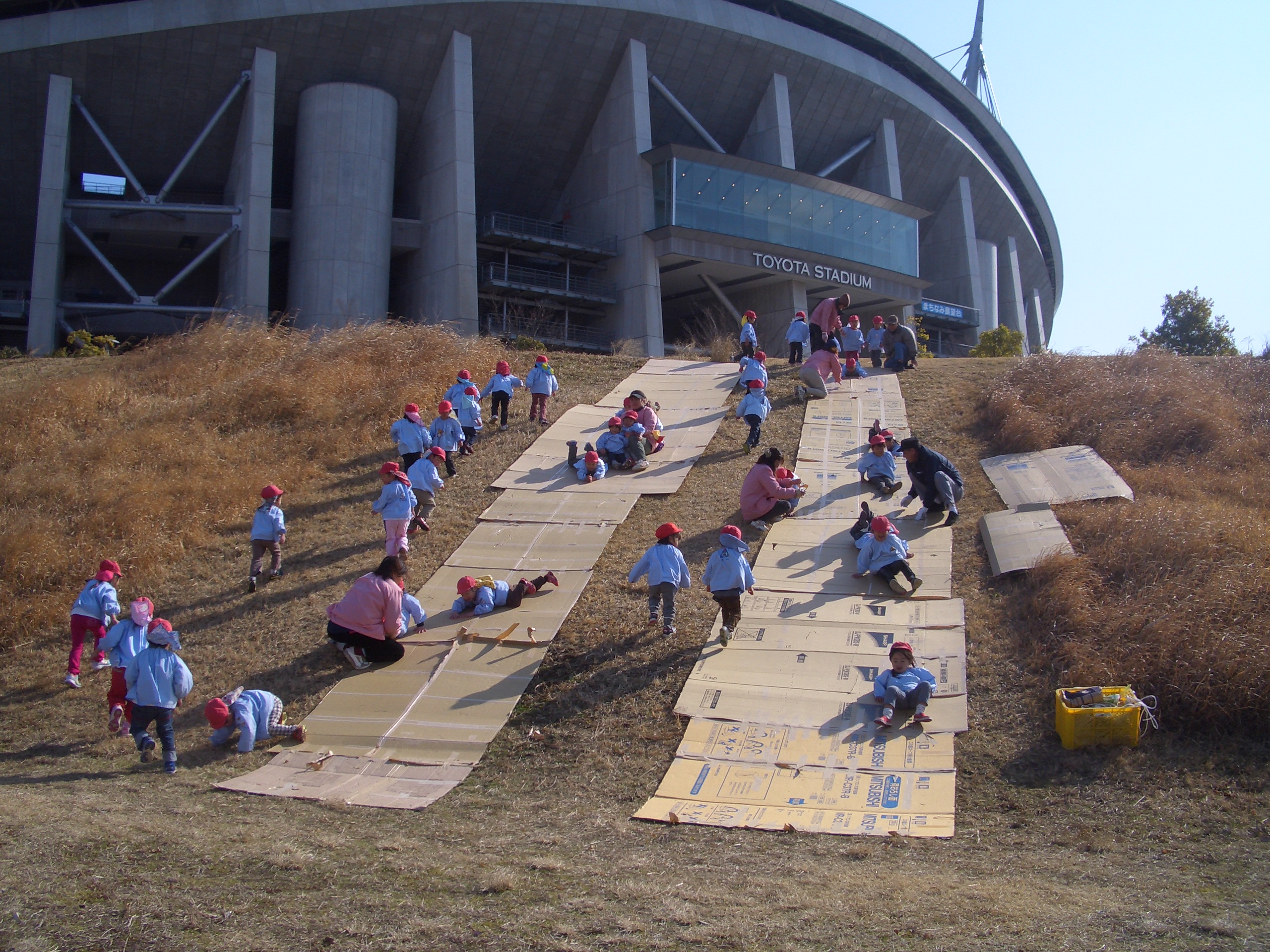 待ちに待った、初めての芝すべり。急な斜面をお友だちと手をつないだり、スーパーマンに変身をして何度もすべる姿がありました。
