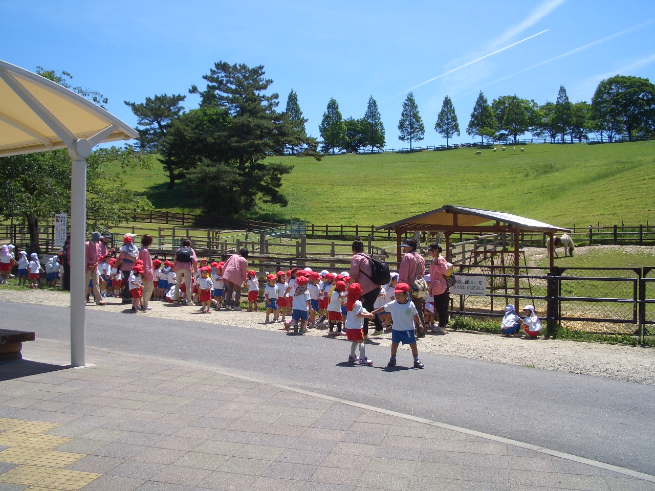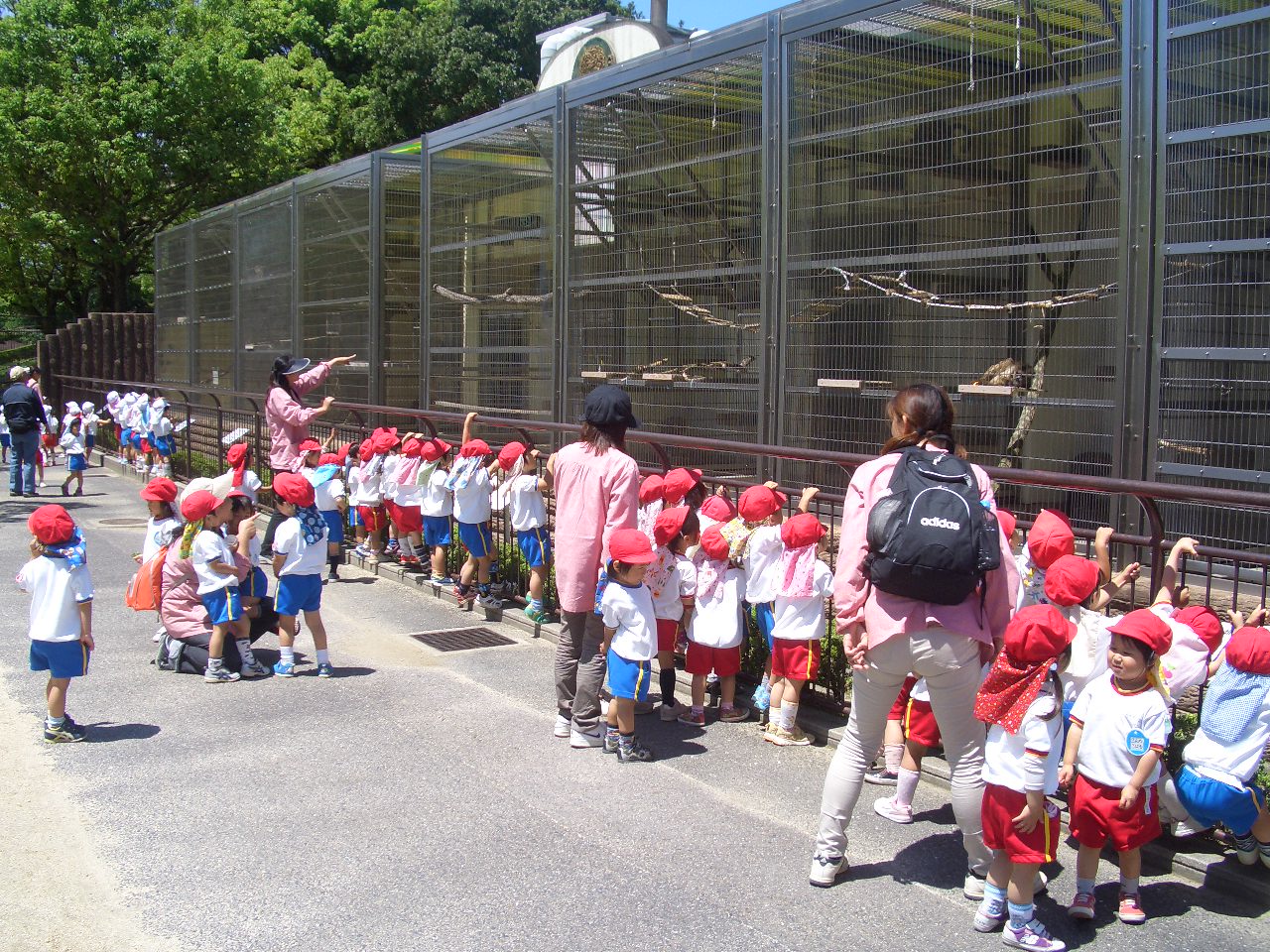 年少児、初めての園外保育。鞍ヶ池公園へ出掛けました。青空の下、目を輝かせて動物を見る子どもたち。ツルの鳴き声にビックリしたり、「わぁ、すごい、ないた」と手をたたきながら喜ぶ姿がありました。最後まで楽しみながら頑張って歩くことが出来ました。