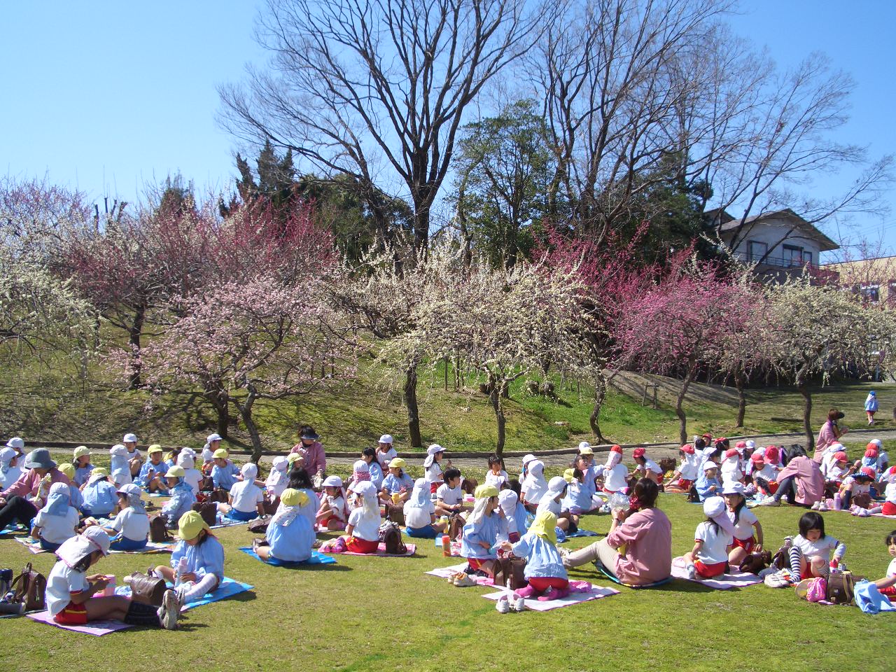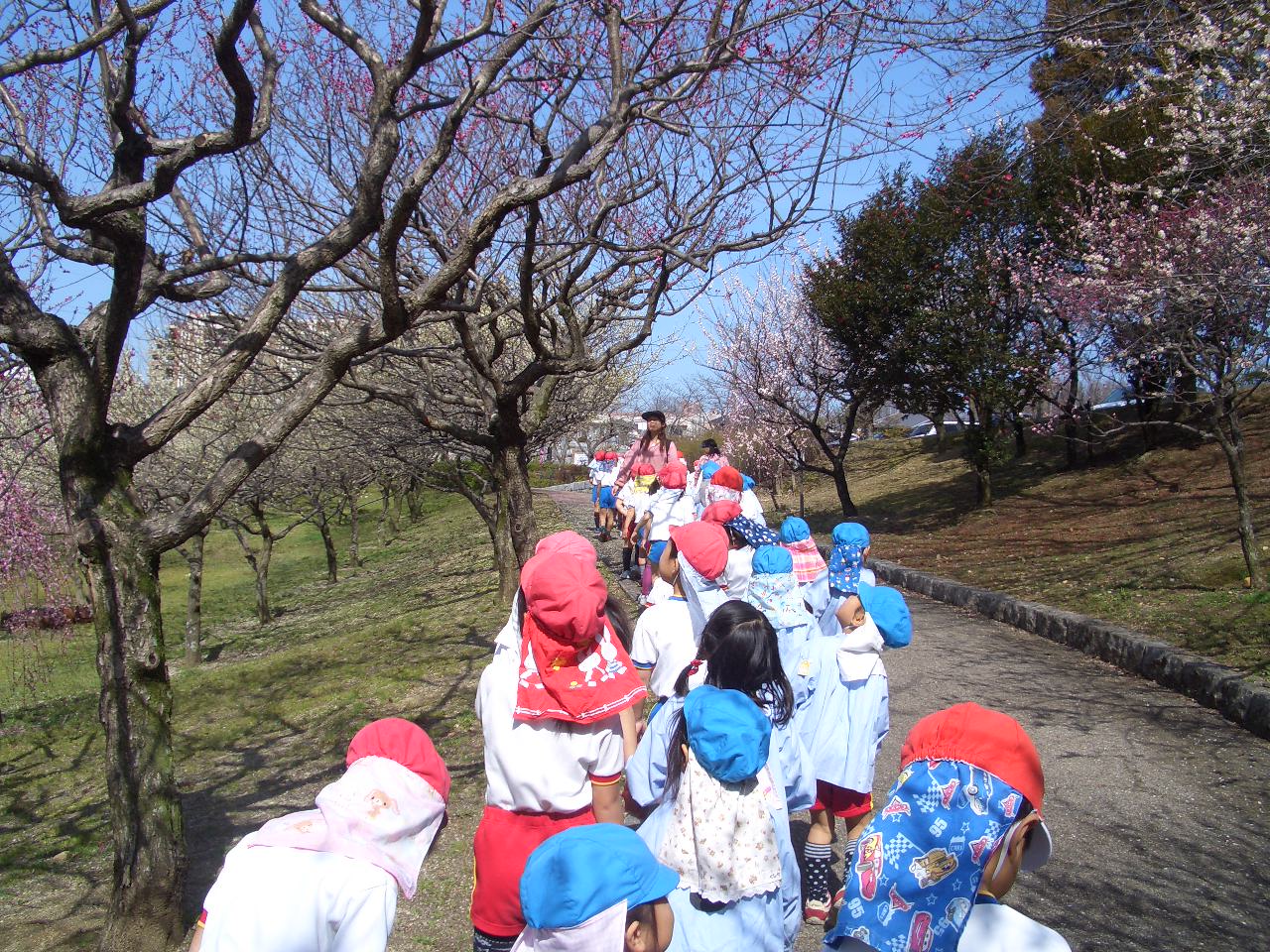 暖かな日ざしの中、年少、年中、年長のみんなで平芝公園に出かけました。梅の花のいい香り、きれいな花を楽しんできました。