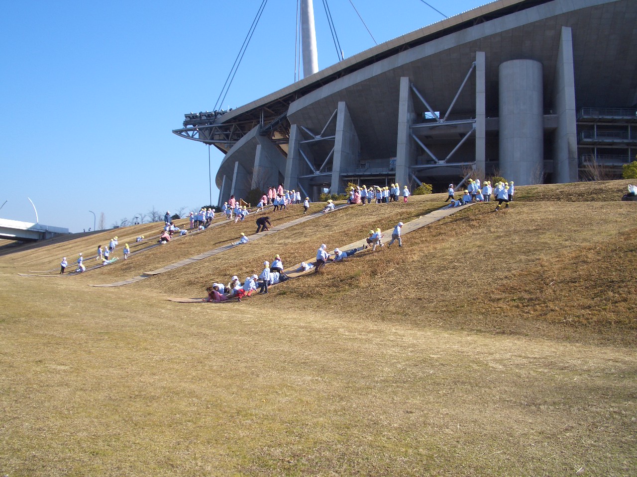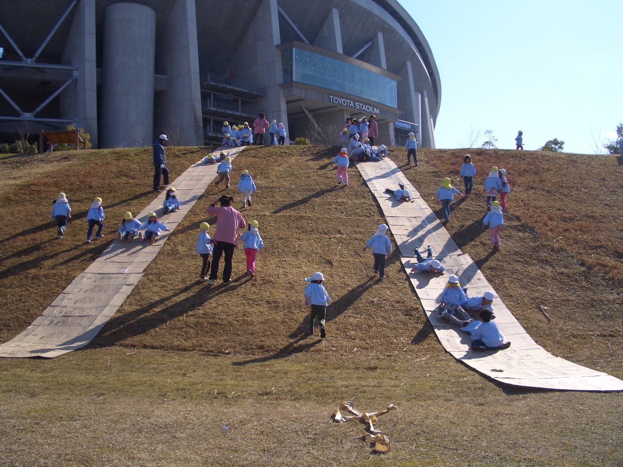 年中児、トヨタスタジアムに芝すべりに行ってきました。寒さも忘れ夢中でダンボ-ルの上を、転がったり、スーパーマンのようになってすべりました。