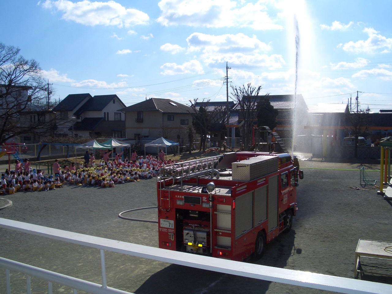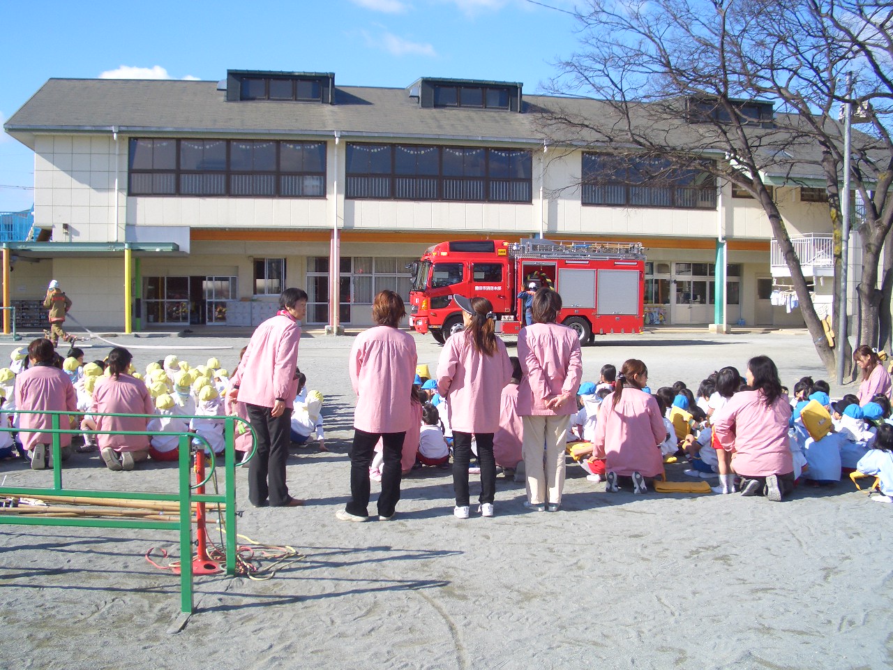今回の地震・火災避難訓練は、自由遊び時間に行いました。消防自動車も園にかけつけてくれました。