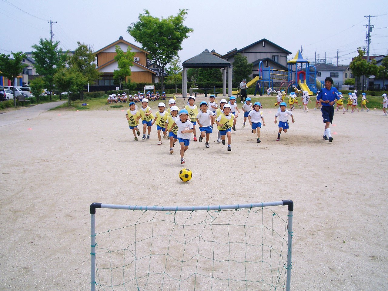 ゴール目指してシュート!みんな元気よく走りボールを追いかけました。