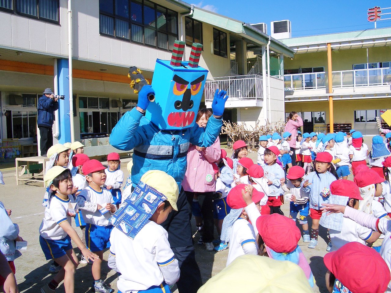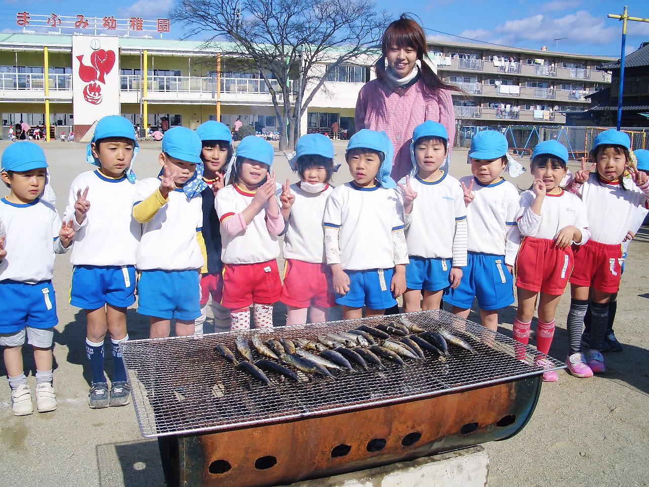 豆をまいて鬼退治。幼稚園に現れた鬼に豆をまき、鰯を焼いて食べました。