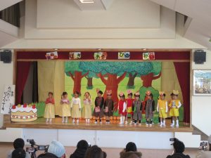 先生たちの工夫を凝らした衣装や小道具も見ものです。一人一人が役のセリフをしっかり覚え、元気な声で発表できました。最後に全員そろってうたう歌も圧巻です。
