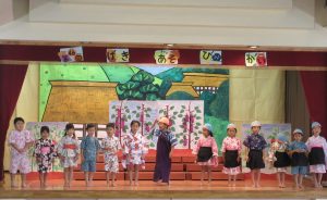 今年はスポーツフェスティバルの後、あまり日もなく、また舞台で練習する時間もなかなかとれず、大変でしたが、そこはさすが年長さん。お部屋での練習をしっかり積み重ねてきました。そのおかげで、初めて舞台でセリフを言った時は自信もなくて声も小さかった子も、日に日におなかから声が出るようになり、本番当日は1番の仕上がりになりました。