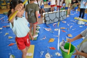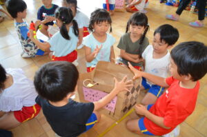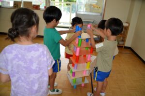 ドミノ倒し・フラフープ送り・まふみタワーを作ろう・なぞときフィッシング、どれもグループみんなで協力しないとクリアできないゲームばかりです。さぁ、頑張れ!年長さん!