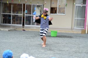 まふみようちえんの年長さんがみずてっぽう大会をしていることを聞きつけて、私たちが困るように、まふみようちえんの水をぜんぶ奪いに来た、というのです。