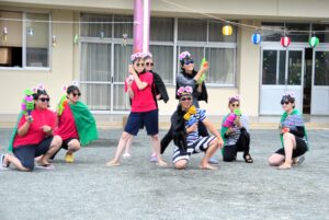 年長さんのパワーでワルワル団のハートは見事に撃ち抜かれ、ワルワル団は力尽きました。次に来た時は仲よく遊ぼう、と言ってワルワル星に帰っていきました。
