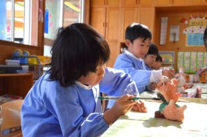 年長さんは紙粘土で、運動会に踊った自分を作りました。紙粘土をこねたりポーズを決めたり、細かいところまで色を塗ったり、難しかったけど頑張りました。