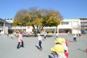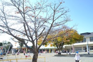 朝、先生たちが出勤してくると、むくの木の葉っぱがたくさん落ちている季節になってきました。