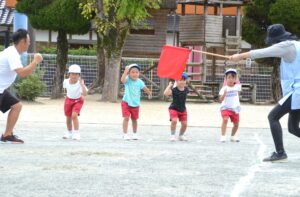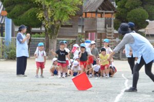 よーいドンは先生の赤い旗をよく見て・・・気合いっぱい、笑顔いっぱいでとても楽しそうに走る年中さんです。