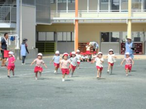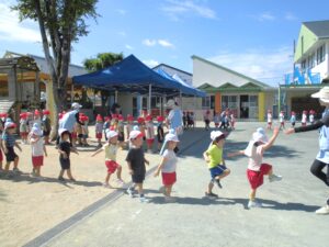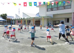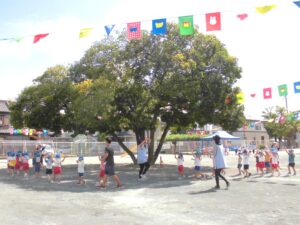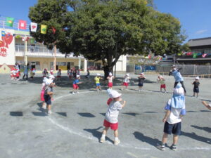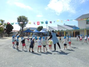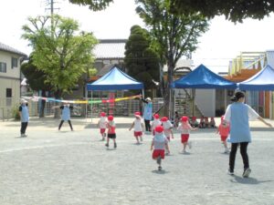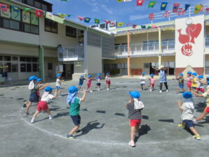やっと外あそびもできるようになってきて、幼稚園の園庭には万国旗も飾られ、運動会あそびが徐々に盛り上がってきました。