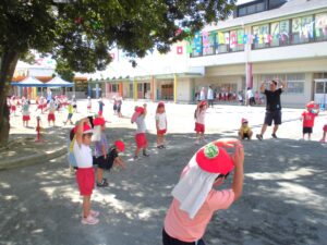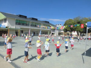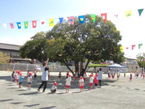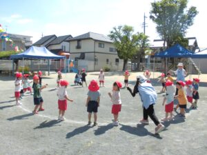 年中さんは今までお部屋で練習していた曲を、初めて園庭で踊りました。