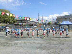 年長さんは園庭いっぱいに広がって踊ります。みんなで声を出すところもあり、踊りもかっこいいです。