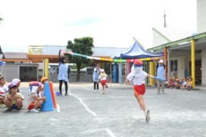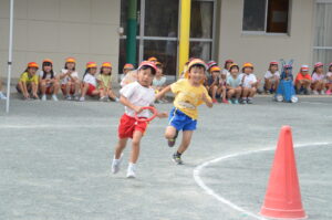 年長さんのリレーは、毎回順位が変わっています。バトンパスやリードの仕方もうまくなってきて、だいぶいい勝負ができるようになりました。