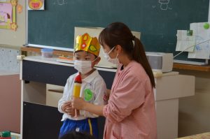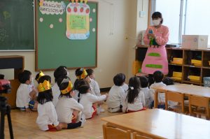 しばらくの間、コロナ感染拡大防止のため、歌をうたうことはお休みしていましたが、先月からマスクをして『たんじょうびはうれしいな』とそれぞれの月の歌をうたってお祝いしています。今月のうたは『こぎつね』や『まつぼっくり』『まっかなあき』などです。