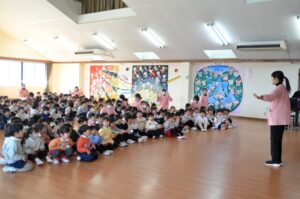 元気に園歌をうたって、園長先生のお話を聞きます。