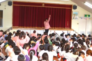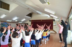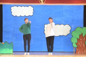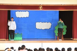 先生の出し物では、けんかをしちゃったけど「ごめん」が言えてまた仲良しになれるお友だちの劇を観ました。ゴムとびやまりつきなどの昔ながらの遊びが出てきたり、お友だち同士のトラブルは普段の生活の中でもよくあることなので、とても興味深く真剣に見ているまふみっこたちでした。