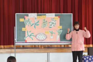 今日の給食は七草ごはんでした。司会の先生のお話を思い出し、七草の名前を挙げながらおいしく給食をいただきました。