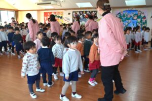 遊戯室に全員が集まり、三学期の始業式が始まりました。