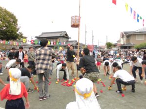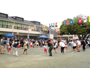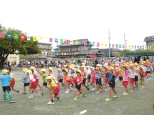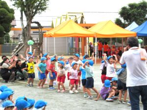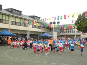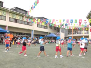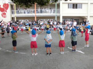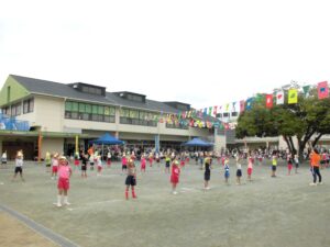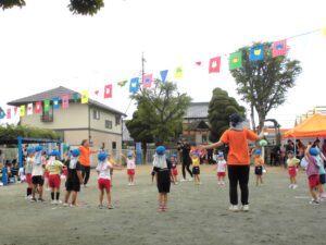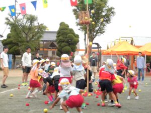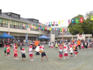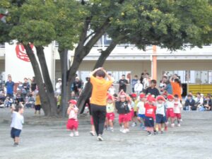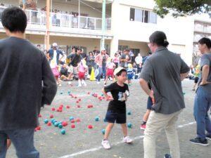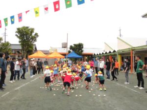 クラスごとに輪になって玉入れをしますが、今日は単なる玉入れではありません。「チェッチェッコリ」の曲に合わせて、みんなでダンシング‼