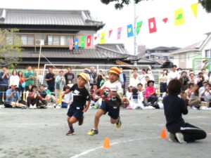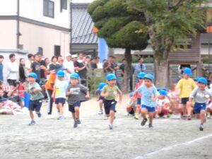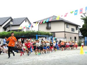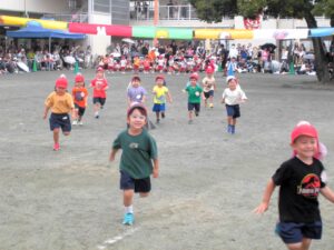 走りながらお家の方に手をふる子、ゴールを目指して全速力で走る子、「たのしー!」とニコニコしながら走る子と様々ですが、全員がゴールまで走りきることができ、観客席からもあたたかい応援をいただきました。