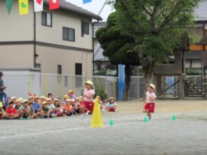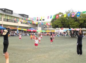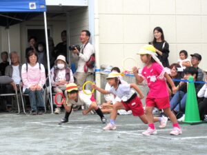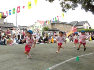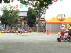 プログラム1番の年中さん競技『それいけ!かけっこ』では、練習の成果がよく出ていて、みんな「よーいドン!」の体勢やコーナーをまわるのもとても上手になりました。