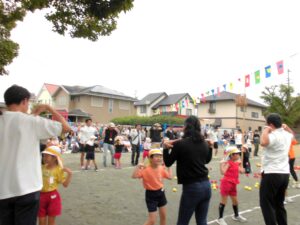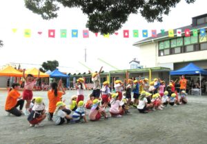 年中さんの遊戯『おかしなふぇすてぃばる』では、リトルモンスターたちが集まって年に一度のフェスティバルを楽しむかわいい曲に合わせて、年中さんたちが元気いっぱいに踊ります。