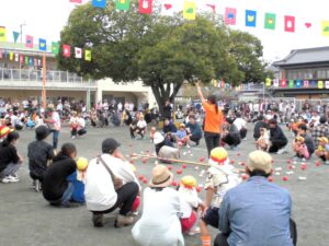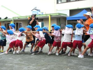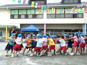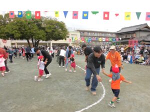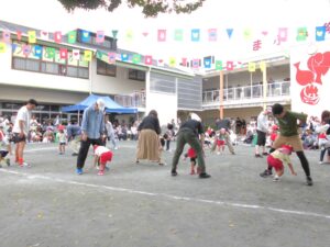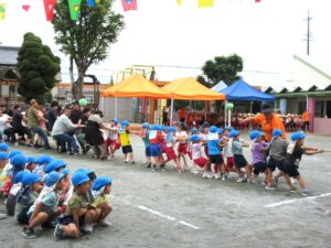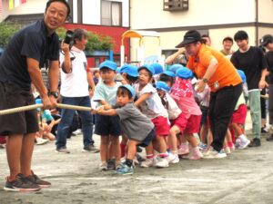 年中さんの親子競技つなひきは、その名も『ギュッと‼引っ張れ親子のチカラ』。クラス対抗戦とあって、どのクラスもお家の方のみなさんのパワーがすごく、とっても盛り上がりました。